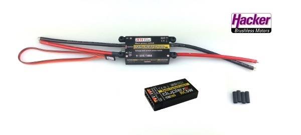 Dieses Set des Main Switch wird mit dem RC Switch geliefert. Der RC-Switch kann mit den JETI Duplex DC/DS Sendern drahtlos betätigt werden. Obwohl der Main Switch vorrangig für den Einsatz als Hauptschalter im RC-Modell konstruiert wurde, lässt er sich auch für viele andere Anwendungen zur Schaltung einer Stromversorgung nutzen.