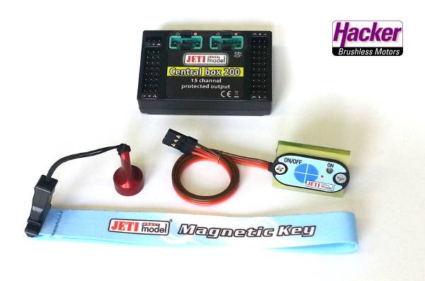 Die CentralBox 200 stellt eine Kombination aus einer hochbelastbaren Akkuweiche ohne Spannungsreduzierung, 15 programmierbaren und abgesicherten Servoanschlüssen und bis zu 3 Telemetrieanschlüssen dar. Es können bis zu 2 Empfänger oder Satelliten mit seriellem- (JETI EX-Bus) oder PPM-Summensignal angeschlossen werden. Die Inbetriebnahme erfolgt mit einem codierten Magnetschalter, ein unerwünschtes Ausschalten durch Vibrationen oder Schalterdefekt ist dadurch ausgeschlossen.