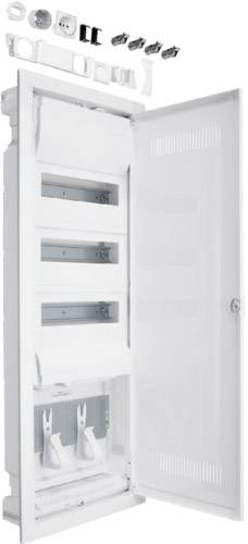 Installationskleinverteiler für Hohlwandeinbau aus Kunststoff von der Firma Hager. Bestehend aus Kunststoff-Mauerkasten mit serienmäßigem Leitungsabfang und ausbrechbaren Leitungseinführungsschieber mit Schnappbefestigung sowie integrierter Wasserwaage. Hohlwandbefestigung mit Schnellfixierungshebel - seitlich oder oben/unten montierbar. Türanschlag rechts oder links ohne Blendrahmendemontage. Lüftungstür mit nicht transparenter Kunststoffplatte zur besseren Ausbreitung des WLAN-Signals gegenüber einer Blechtür. 3-reihiger Geräteträger aus verzinktem Stahlblech. Fingersichere PE/N-Klemme mit Stecktechnik in montagefreundlicher Schnapptechnik. Zur sicheren Trennung zwischen Multimediateil und Stromkreisverteilung ist eine Abschottung montiert, die gleichzeitig auch die Aufnahme für bis zu zwei Steckdosen ermöglicht. Gerätehalter für die schraublose Befestigung von Geräten zur direkten Montage auf dem Lochblech durch einhängen oder verschrauben liegen bei. Kabelführungsklammern können in den dafür vorgesehenen Schnellbefestigungen links und rechts eingebaut werden.