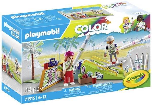 Bring Farbe ins Spiel mit PLAYMOBIL Color! Der Skatepark ist geschmückt mit kunstvollen Graffitis und überall tummeln sich coole Skateboards. Gestalte die Figuren und ihre Skateboards mit den enthaltenen Stiften so, wie Du möchtest und zeichne tolle Graffitis auf die Rampe. Die Farbe lässt sich ganz leicht wieder abwaschen - für nie endenden Spielspaß.
