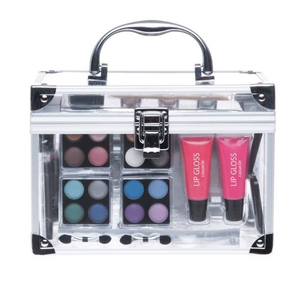 Kosmetikkoffer mit Aluminiumgestell und klarsicht Seiten. Inhalt: 3 Nagellack, Kosmetik-Kompakt 4 x 4 austauschbaren Lidschatten Farben, 2 Blusher, 2 Applikatoren, Spiegel, 2 Lipgloss, Kajalstift, Lippenkonturenstift, 2 Lippenstifte, Anspitzer, 5 Manikür Werkzeuge. Make-Up Set Eyliner pencil LP60001: Ingridients: Ricinus Communis Seed Oil, Ozokerite, Cera Alba, Ethylhexyl Palmitate, Bis-Diglyceryl Polyacyladipate-2, Euphorbia Cerifa Cera, Hydrogenated Polyisobutene, Copernicia Cerifera Cera, Synthetic Wax, Phenoxethanol, Methylparaben, Ethylparaben, Cl 77499. Make-Up Set Eyeshadow-Sleeve: Ingridients: Mica, Talc, Dimethicone, Aluminum Starch Octenylsuccinate, Magnesium Stearate, Solum Diatomeae, Cyclopentasiloxane, Aluminum Hydroxide, Phenoxyethanol, Acrylates Copolymer, Polyethylene Terephthalate, Methylparaben, Propylparaben, Ethylparaben, +/-: Cl 77007, Cl 77891, Cl 77499, Cl 75470, Cl 77510, Cl 77491, Cl 45410, Cl 77492, Cl 77288, Cl 42090. Make-Up Set Blush B6030: Ingridients: Talc, Mica, Dimethicone, Magnesium Stearate, Cyclopentalsiloxane, Methyl Methacrylate Crosspolymer, Phenoxyethanol, Aluminum Hydroxide, Methylparaben, Propylparaben, Ethylparaben, Cl 15850, Cl 77891, Cl 45410, Cl 42090, Cl 19140. Make-Up Set Lip liner pencil LP6030: Ingridients: Ricinus Communis Seed Oil, Ozokerite, Cera Alba, Ethylhexyl Palmitate, Bis-Diglyceryl Polyacyladipate-2, Euphorbia Cerifera Cera, Hydrogenated Polyisobutene, Copernicia Cerifera Cera, Synthetic Wax, Phenoxyethanol, Talc, Methylparaben, Propylparaben, Ethylparaben, Cl 77891, Cl 77492, Barium Sulfate, Cl 15850, Cl 77491. Make-Up Set Lipstick-Sleeve: Ingridients: Paraffinum Liquidum, Synthetic Wax, Ceresin, Ethylhexyl Palmitate, Hydrogenated Polyisobutene, Triisodecyl Trimellitate, Butylene/Ethylene/Styrene Copolymer, Cera Microcristallina, Silica Dimethyl Silylate, Phenoxythanol, Mica, Talc, Methylparaben, Propylparaben, Ethylparaben, +/-: Cl 77891, Cl 15985, Cl 15850, Barium Sulfate, Cl 77492, Cl 77491, Cl 77499. Make-Up Set Nail Polish-Sleeve: Ingridients: Butyl Acetate, Nitrocellulose, Acetyl Tributyl Citrate, Isopropyl Alcohol, Phthalic Anhydride/Trimellitic Anhydride/Glycols C, Adipic Acid/Fumaric Acid/Tricyclodecane Dimethanol Copolymer, Stearalkonium Hectorite, Mica, Citric Acid, Talc, +/-: Cl 77891, Cl 77499, Cl 77492, Cl 77491. Make-Up Set Blush B6017: Talc, Mica, Dimethicone, Magnesium Stearate, Cyclopentasiloxane, Methyl Methacrylat Crosspolymer, Phenoxyethanol, Methylparaben, Propylparaben, Ethylparaben, Cl 77891, Cl 77492, Cl 45410, Cl 77491, Cl 77499. Make-Up Set Lipgloss LG6248: Ingridients: Polyisobutene, Paraffinum, Liquidum, Triisodecyl Trimellitate, Polyethylene, Butylene/Ethylene/Styrene Copolymer, Cera Microcristallina, Mica, Ethylhexyl Palmitate, Silica, Dimethyl Silylate, Hydrogenated Polyisobutene, Sorbitan Sesquilsostearate, Titanum Dioxide, Aluminum Hydroxide, Phenoxethanol, Methylparaben, Propylparaben, Ethylparaben, Cl 15850, Cl 45410. Make-Up Set Lipgloss LG6252: Ingridients: Polyisobutene, Paraffinum Liquidum, Triisodecyl Trimelliatete, Polyethylene, Styrene Copolymer, Cera Microcristallina, Silica Dimethyl Silylate, Ethylhexyl Palmitate, Hydrogenated Polysibutene, Aluminum Hydroxide, Sorbitan Sesquiisostearate, Phenoxyethanol, Mica, Titanium Dioxide, Methylparaben, Propylparaben, Ethylparaben, Cl 77891, Cl 45410, Cl 19140. Make-Up Set Eyeshadow-Sleeve HE7916: Ingridients: Mica, Talc, Dimethicone, Aluminum Starch Octenylsuccinate, Magnesium Stearate, Solum Diatomeae, Cyclopentasiloxane, Phenoxyethanol,Polythylene, Terephthalate, Acrylates Copolymer, Methylparaben, Propylparaben, Ethylparaben, +/-: Cl 77499, Cl 77891, Cl 77491. Make-Up Set Eyeshadow-Sleeve HE7349: Ingridients: Mica, Talc, Dimethicone, Aluminum Starch Octenylsuccitane, Magnesium Stearate, Solum Diatommeae, Cyclopentasiloxane, Phenoxyethanol, Methylparaben, Propylparaben, Ethylparaben, +/-: Cl 77891, Cl 77499, Cl 77491, Cl 77492, Cl 77510. Make-Up Set Eyeshadow-Sleeve E6185: Ingridie
