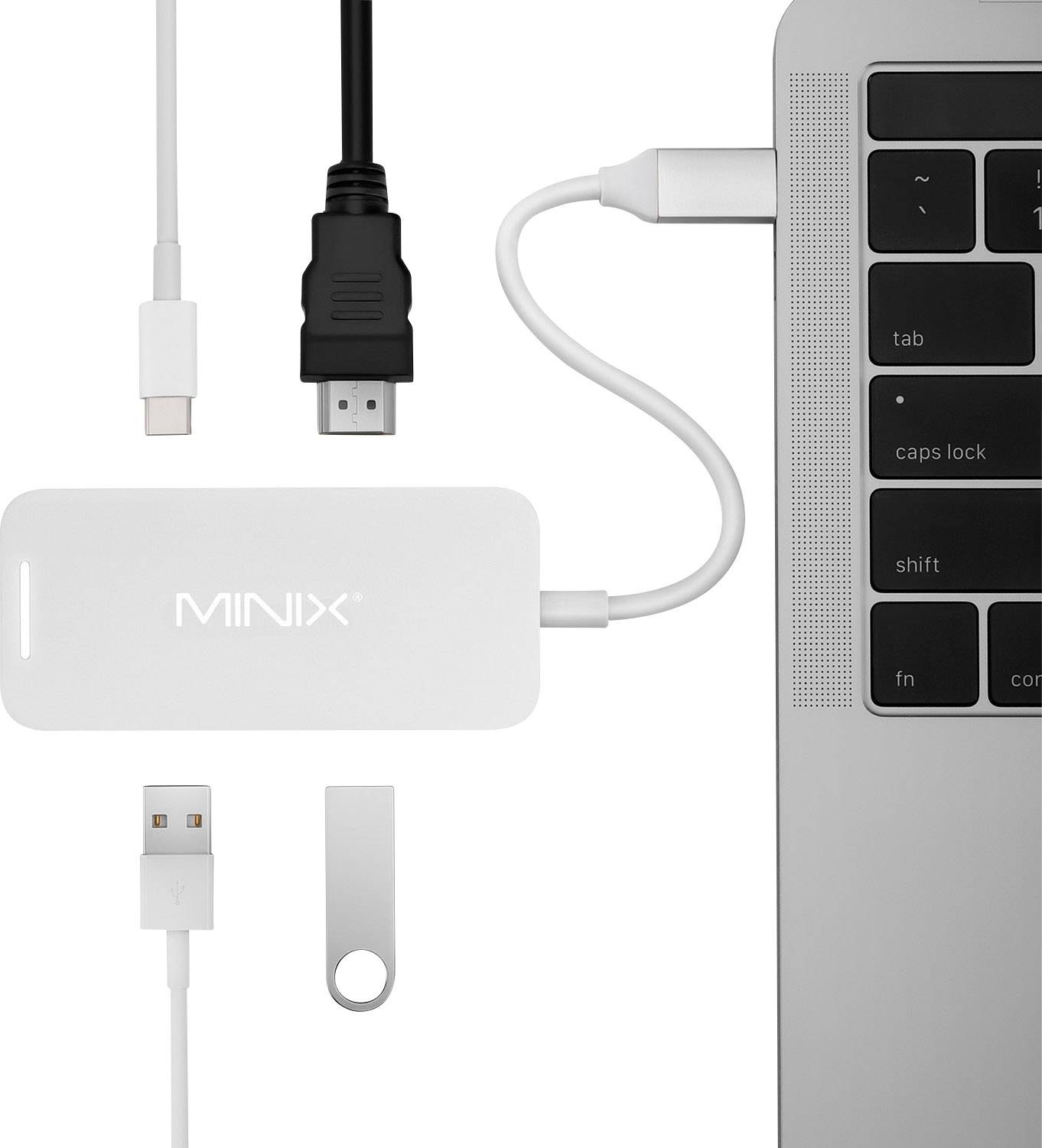 Mit dem MINIX NEO C Mini - USB-C® Multiport Adapter können Sie Ihr MacBook/Notebook mit USB-C®-Anschluss an ein HDMI-Display und gleichzeitig zwei Standard-USB-Geräte und ein USB-C®-Ladekabel anschließen.