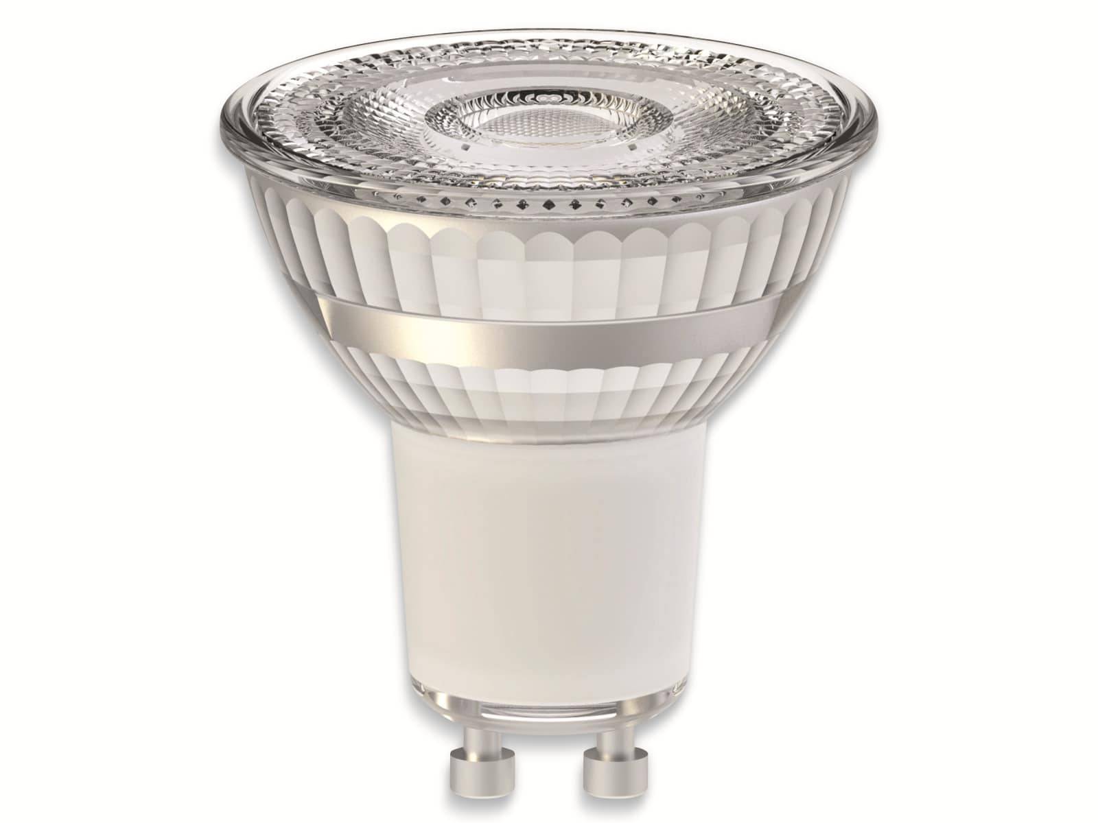 Dieser gläserne LED Strahler ist ausgestattet mit 5.5 Watt und erstrahlt im warmweißen Licht. Dieses Licht wird über die Streuscheibe gebündelt und fungiert somit dank kleinem Abstrahlwinkel als „Spotlight“, womit einzelne Objekte ideal beleuchtet werden können. Features: - Hohe Schaltfestigkeit - Sofort voller Lichtstrom - Kleiner Abstrahlwinkel für die Beleuchtung mit „Spotlight-Effekt“ - Geringe Wärmebildung Technische Daten: - Energieeffizienzklasse: E - EEK-Spektrum: A – G - Gewichteter Energieverbrauch: 6 kWh/1000 h - Bauform: PAR16 - Schutzart: IP20 - Leistung: 5,5 W - Entspricht Glühlampe: 50 W - Betriebsspannung: 220…230 V~ - Verschiebungsfaktor: > 0,5 - Lichtstrom: 540 lm - Lichtausbeute: 98 lm/W - Lichtstromerhalt am Ende der Nennlebensdauer: > 93 % - Lichtfarbe: warmweiß - Farbtemperatur: 2700 K - Farbwiedergabeindex (CRI): > 80 Ra - Abstrahlwinkel: 36° - Temperaturbereich: -20...+40 °C - Mittlere Lebensdauer: 15000 Stunden - Schaltzyklen: > 50000 - Sockel: GU10 - Dimmbar: ja - Gesamtmaße (ØxH): 50x54 mm
