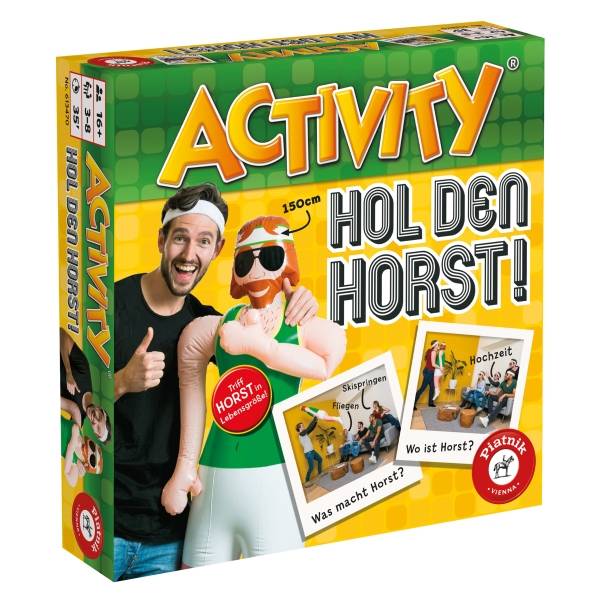 Activity Hol den Horst!Keine Party ohne Horst!1,50 Meter groß, gut gebaut und verschwiegen: das ist Horst, der aufblasbare Gummikollege und Namesgeber der neuesten Activity-Ausgabe.Wer sich mit ihm einlässt, darf sich auf fantasievolle und Bewegungsreiche gemeinsame Zeit freuen. Zusammen mit Horst gilt es, möglichst viele Begriffe pantomimisch so darzustellen, dass sie von den Mitspielern rasch erraten werden. Für erratene Begriffe gibt es am Ende Punkte. Allerdings: nach einer Minute ist alles vorbei - Horst wechselt den Partner, öfter als seine aufgedruckten Tennissocken! Lust auf mehr! Dann Holt den Horst, pustet ihn auf und lasst die Puppe tanzen!