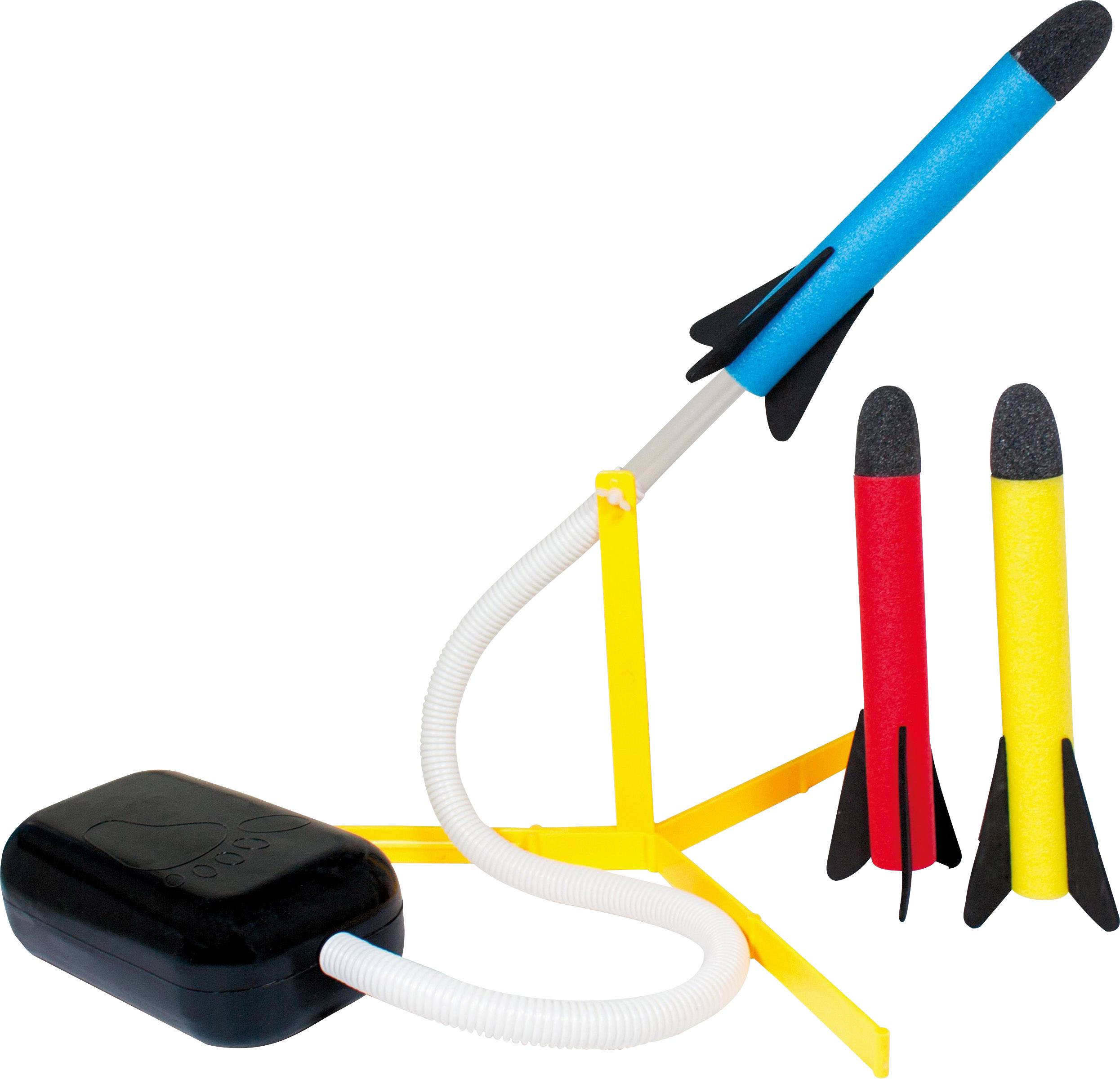 Mit einen kräftigen Tritt auf den Blasebalg werden die Raketen abgefeuert. Inkl. drei Schaumstoff-Raketen.