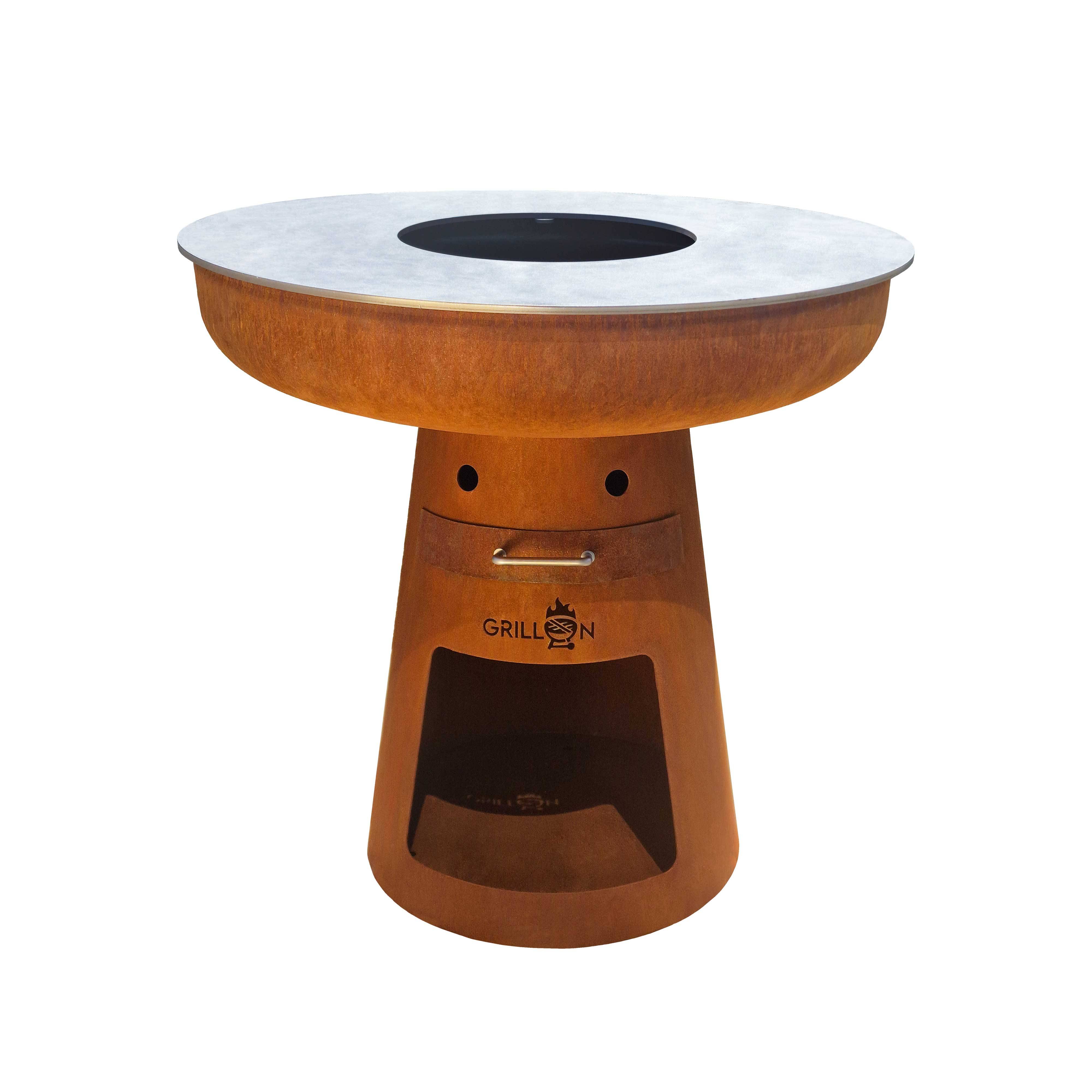 Ein robuster Sockel mit Oberfläche aus edlem Rost, das Material bildet unter der oberflächlichen Rostschicht eine dichte Sperrschicht, die den Körper vor weiterer Korrosion schützt, mit Schublade für die Asche und genügend Platz für das Holz, darauf eine Feuerschale die aus einem Stück geformt ist, in der Mitte befindet sich der massive Grillrost (Nicht im Lieferumfang) und eine 8 mm starke Grillplatte mit extragroßer Grillfläche am Rand. Die Feuerplatte bietet optimale Hitzeverteilung mit unterschiedlichen Temperaturzonen, sodass z.B. Fleisch angebraten, Gemüse, Fisch und Meeresfrüchte gegart und gedünstet, sowie fertige Speisen warmgehalten werden können.