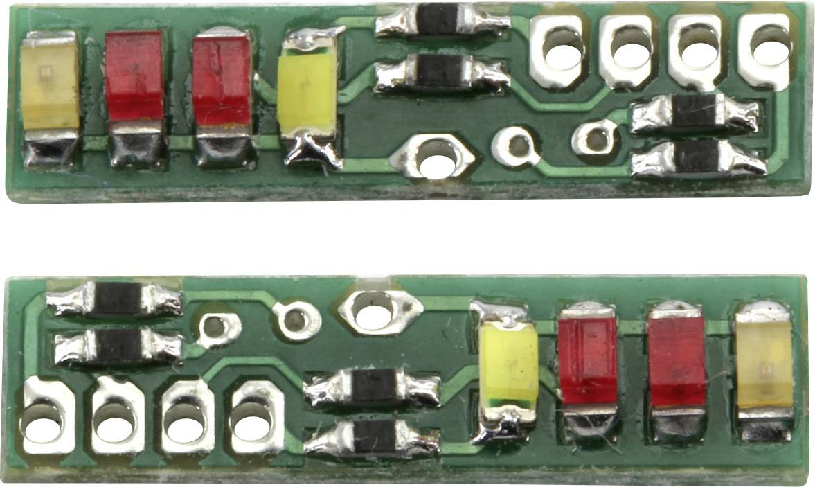 Auf diesen Lichtträgern (2er-Set) sind bereits alle Widerstände und Dioden aufgelötet, die für die Heckbeleuchtung eines 1:87 LWK’s benötigt werden. Auf jeder Platine ist eine weiße LED für den Rückfahrscheinwerfer, eine gelbe für den Blinker, eine rote LED als Rücklicht und eine weitere rote LED als Bremslicht (etwas heller als das Rücklicht) montiert. Je nach Fahrzeugtyp können die Lichtträger waagrecht (z.B.) Sattelschlepper oder senkrecht (Z.B.- Feuerwehr) montiert werden. Der Lichtträger ist für 3,7 - 4,8 Volt ausgelegt.