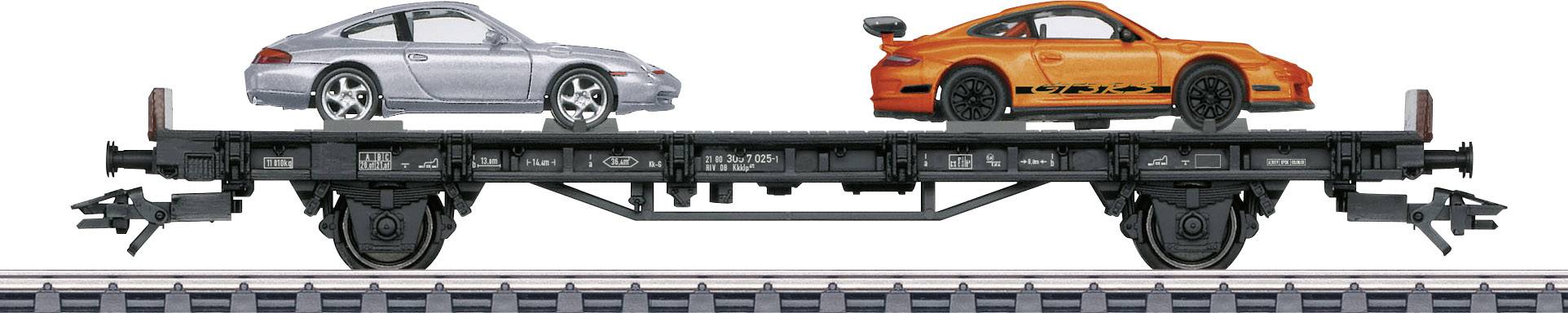 Flachwagen mit langem Radstand. Flachwagen-Aufbau mit Haltevorrichtungen für Kraftfahrzeuge. Beladen mit 1 Porsche-Modell der Firma Herpa und 1 Porsche-Modell der Firma Schuco. Länge über Puffer 15,5 cm.