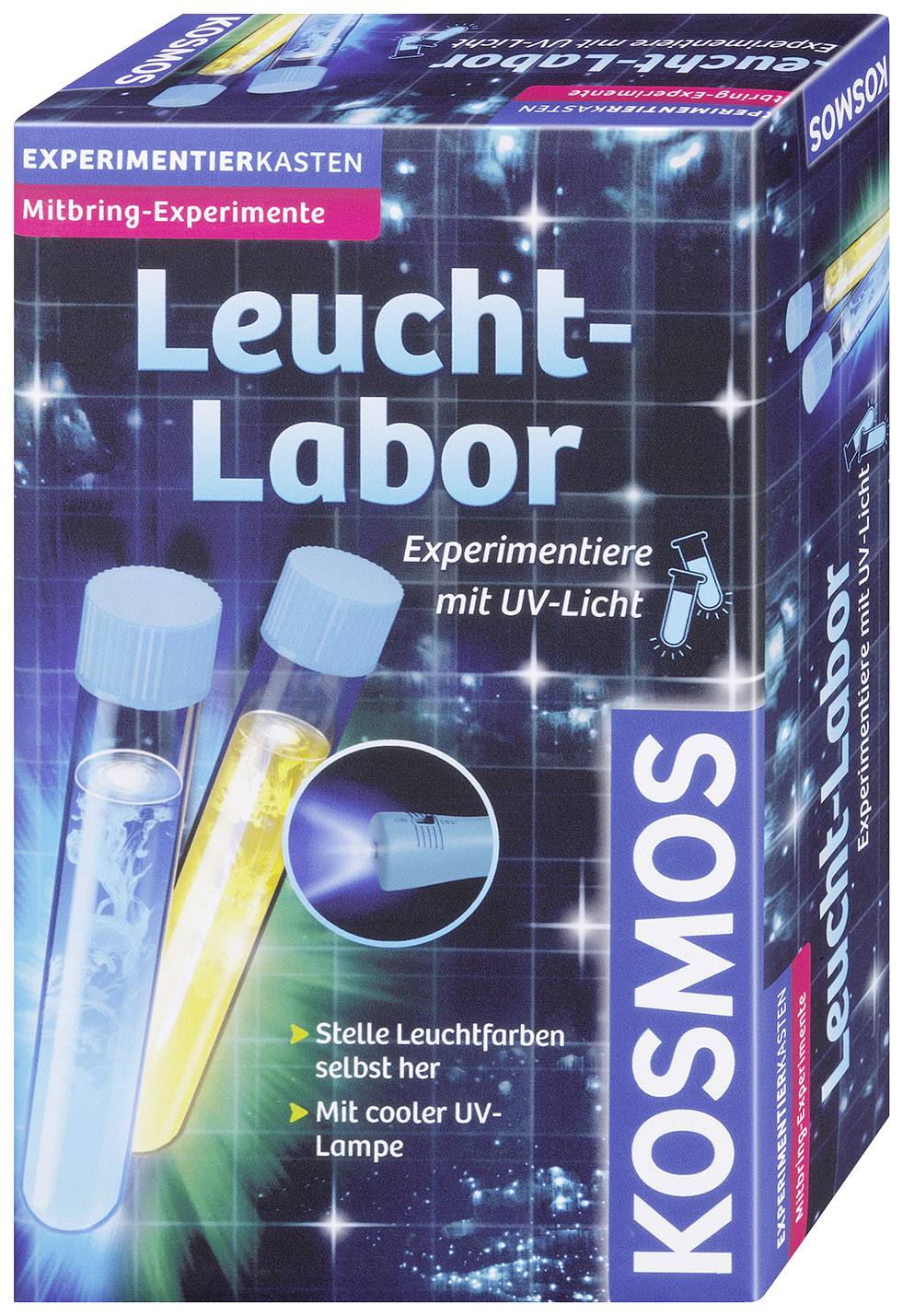 Mit diesem Set können die verschiedensten Leuchtfarben hergestellt werden – ob mit dem beiliegenden Farbstoff oder mit Materialien aus dem Haushalt, beispielsweise mit Curry, Papier, Waschmittel, Zahnpasta und vielem mehr. Die Anleitung erklärt genau wie die Flüssigkeiten hergestellt und ins Reagenzglas gefüllt werden müssen, bevor sie mit der UV-Lampe zum Leuchten gebracht werden. Die chemischen Hintergründe werden kindgerecht erläutert. Es ist überraschend, was alles im UV-Licht leuchtet und warum!