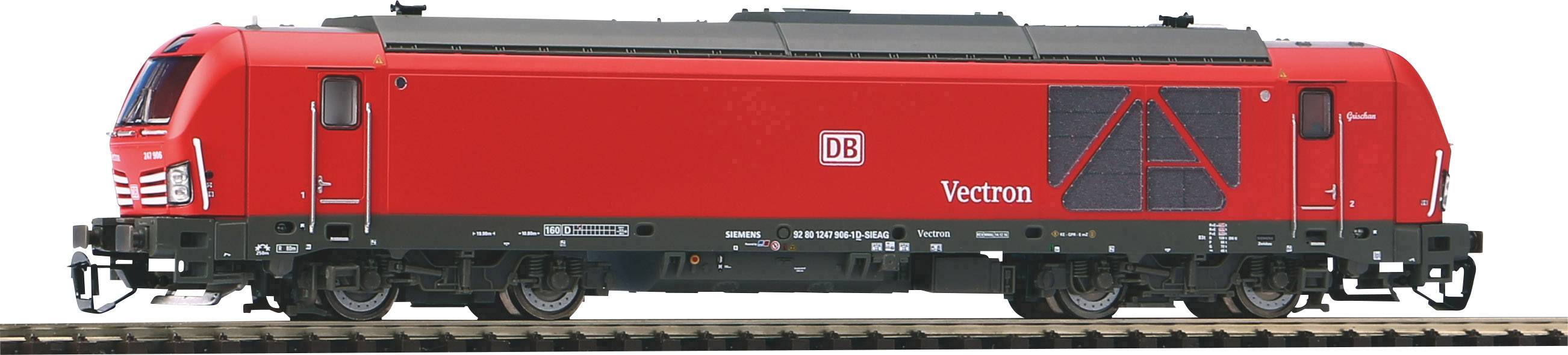 Druckvariante der Diesellok BR 247 in verkehrsroter Farbgebung der DB AG in Ep. VI. Mit den TT Modellen des Vectron erfüllt PIKO die Wünsche von PIKO Fans, die sich modernster Lokomotivtechnik verschrieben haben. Ob Vectron Diesel- oder Elektrolok – beide TT Modelle zeichnen sich durch ihre absolute Vorbildtreue aus und berücksichtigen hierbei auch die Unterschiede, die es u. a. bei den Fahrzeuglängen, den Drehgestellabständen und zahlreichen äußerlichen Gestaltungsdetails gibt. Beide Modellvarianten sind mit kräftigen Motoren mit je zwei Schwungmassen ausgestattet. Die vier angetriebenen Achsen verfügen über zwei diagonal angeordnete Haftreifen auf den jeweils inneren Achsen der Drehgestelle. Die Modelle besitzen PluX22-Schnittstellen und sind für den Digitalbetrieb inklusive Soundnachrüstung vorgesehen.