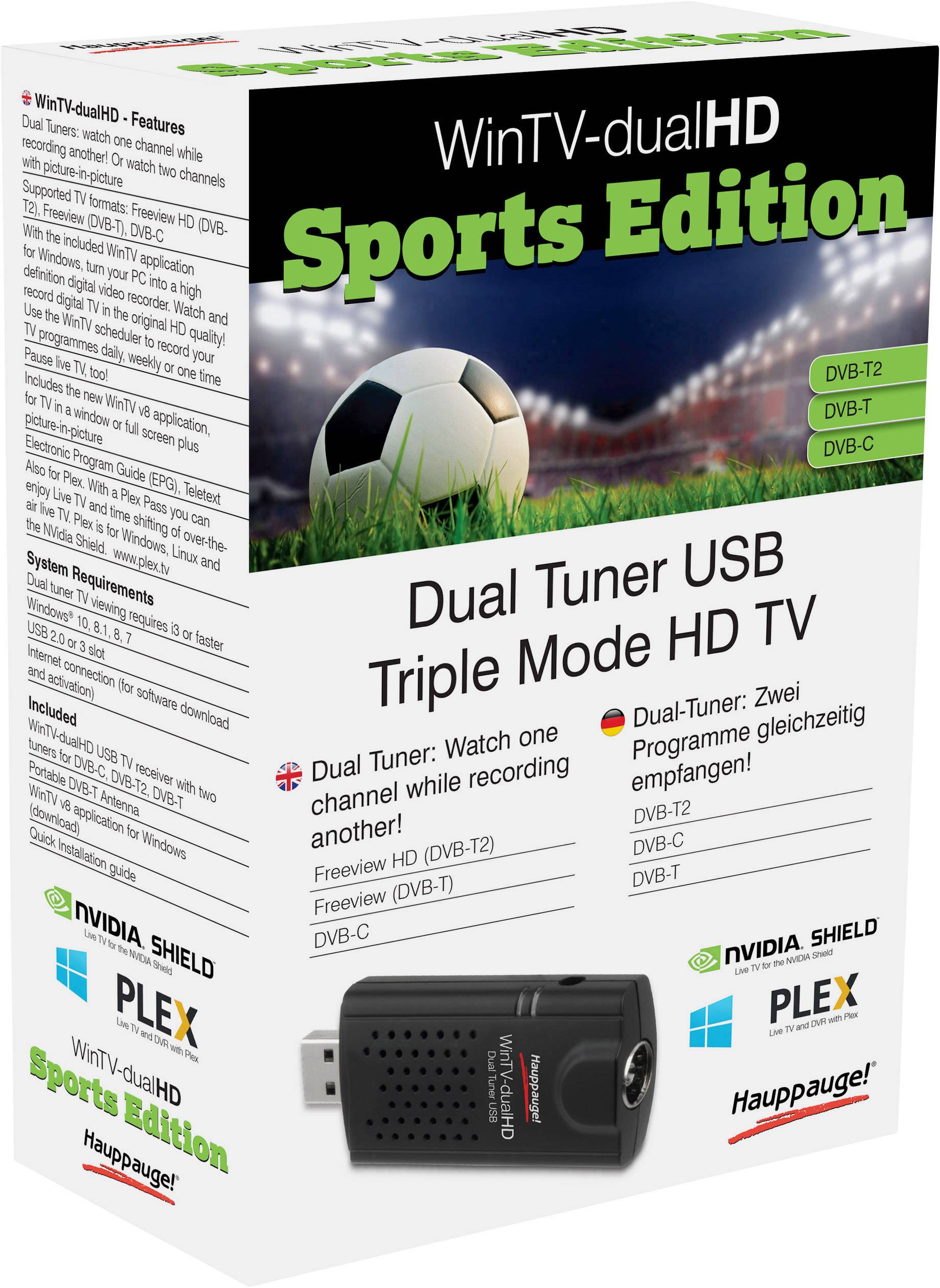 Hauppauge WinTV Dual Tuner Sport Edition TV + USB Kabel + Tragbare DVB-T-Antenne + WinTV v8.5 Software (als Download) mit MPEG-2, H.264 und H.265/HEVC Decodern + Bedienungsanleitung