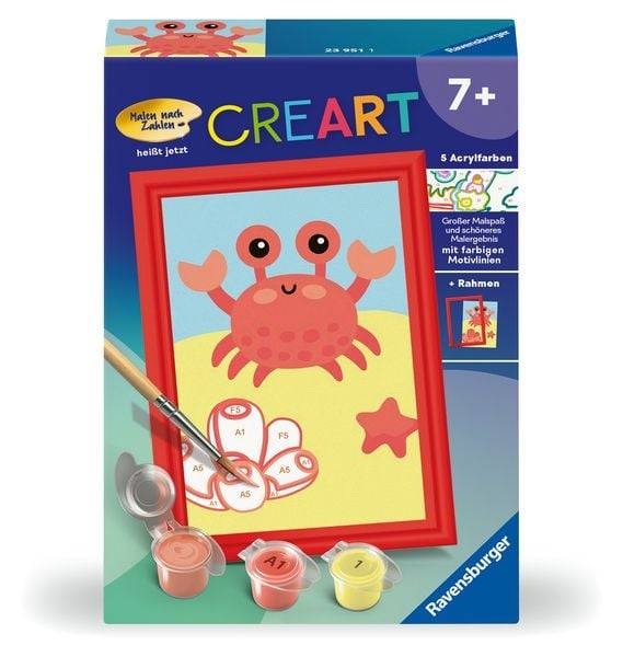 Farbige Motivlinien: Größerer Malspaß & ein schöneres Ergebnis!Dank der farbigen Motivlinien, können die Kinder das ganze Motiv Fröhliche Krabbe und die Farben schneller erkennen. Der Pinsel hat eine gute Führung und so entsteht nach und nach ein perfektes Bild.Die schönen Motive zum Ausmalen sind eine tolle Geschenkidee für Kinder ab 7 Jahren und eine schöne Dekoration für das Kinderzimmer. In diesem Malset sind bereits 5 fertig gemischte Acrylfarben enthalten.Mit Malen nach Zahlen von Ravensburger lernen die Kinder Flächen sorgfältig auszumalen, ihr Maltalent zu verbessern sowie feinmotorische Fähigkeiten zu entwickeln. Am Ende stehen Freude, Stolz und ein Erfolgserlebnis, das die Lust am Weitermalen weckt.Die Motive sind altersgerecht in drei Schwierigkeitsstufen umgesetzt: von einfachen Bildern mit wenigen, großen Malflächen bis hin zu Bildern mit vielen, kleinen Malflächen für Fortgeschrittene.Jedes Malset enthält alles, was Künstler zum Malen brauchen und es ist kein Mischen der Farben notwendig.Das Ravensburger Malen nach Zahlen Programm bietet eine große Motivauswahl für Kinder und Erwachsene. 1 Maltafel (Format 8,5x12 cm), 5 Acrylfarben auf Wasserbasis in wiederverschließbaren Näpfchen, 1 Qualitätspinsel, Farbpalette, Bilderrahmen, Vorlageblatt und Anleitung.