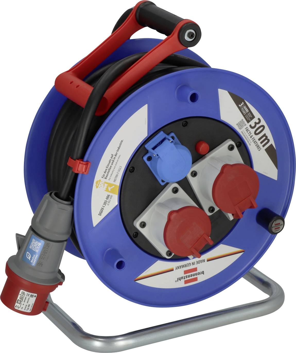 Baustellen-Kabeltrommel mit 30m Kabellänge (H07RN-F 5G2,5) RN-Kabel - sehr robust, ölbeständig und für den professionellen Einsatz besonders geeignet;CEE-Kabeltrommel mit 3-poliger Sicherheitsabschaltung, Überhitzungsschutz und praktischer Trommelbremse, die ein Abrollen des Kabels beim Transport verhindert;Trommelkörper aus Spezialkunststoff auf verzinktem Tragegestell - für den Baustelleneinsatz nach DGUV 203-006 (ehem. BGI 608) und den ständigen Einsatz im Freien;Die Outdoor Kabeltrommel bietet 2 CEE Steckdosen 400V/16A und eine spritzwassergeschützte Schutzkontakt-Steckdose 230V;Die Kabeltrommel ist mit dem innovativen Tragegriff "cablepilot" ausgestattet, welcher freie Hände beim Transport, praktisches Aufhängen und schnelles Ab- und Aufrollen ermöglicht