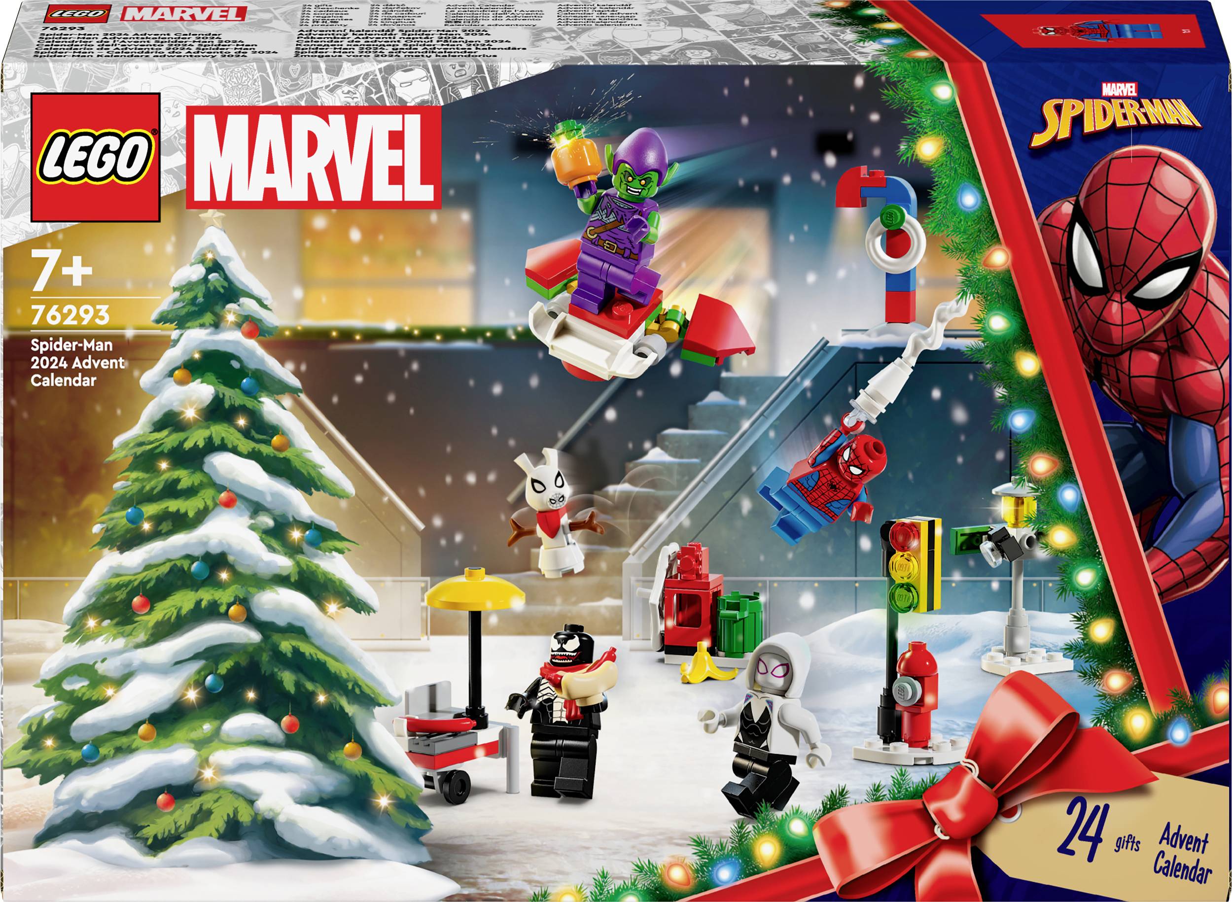 An jedem Tag im Advent kann dein Kind hinter jedem Türchen ein Geschenk entdecken. Dein Kind darf sich auf 5 Minifiguren – Spider-Man, Green Goblin, Miles Morales, Ghost-Spider und Venom – sowie auf kleine Bauspielzeuge und Zubehörelemente freuen, die ihm aus den Filmszenen mit Spider-Man in den Straßen von New York City vertraut sind. Hierzu zählen unter anderem ein Spider-Ham aus Schnee, Peter Parkers Schreibtisch und Electros Winterbaum. 2 kleine Autos können gegeneinander Rennen fahren, und das Katapult von Sandman schleudert Geschenke! Je näher die Bescherung rückt, desto mehr Modelle und Figuren kann dein Kind kombinieren, um unzählige fantasievolle Abenteuer darzustellen.