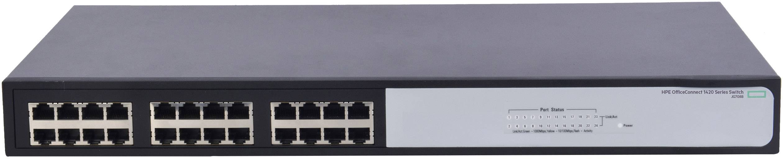 Hewlett Packard Enterprise OfficeConnect 1420 24G. Switch-Typ: ungemanaged. Basic Switching RJ-45 Ethernet Ports-Typ: Gigabit Ethernet (10/100/1000), Anzahl der basisschaltenden RJ-45 Ethernet Ports: 24. Vollduplex. MAC-Adressentabelle: 8192 Eintragungen, Routing-/Switching-Kapazität: 48 Gbit/s. Netzstandard: IEEE 802.3,IEEE 802.3ab,IEEE 802.3u. Rack-Einbau, Formfaktor: 1U