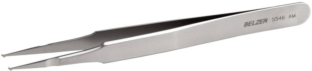 Pinzette mit gerillten Spitzen zum Positionieren und Löten von Chip-Widerständen bis 1 mm Breite. Werkstoff: Edelstahl, antimagnetisch, säurebeständig. Ausführung: Micro-Matt, blendfrei.