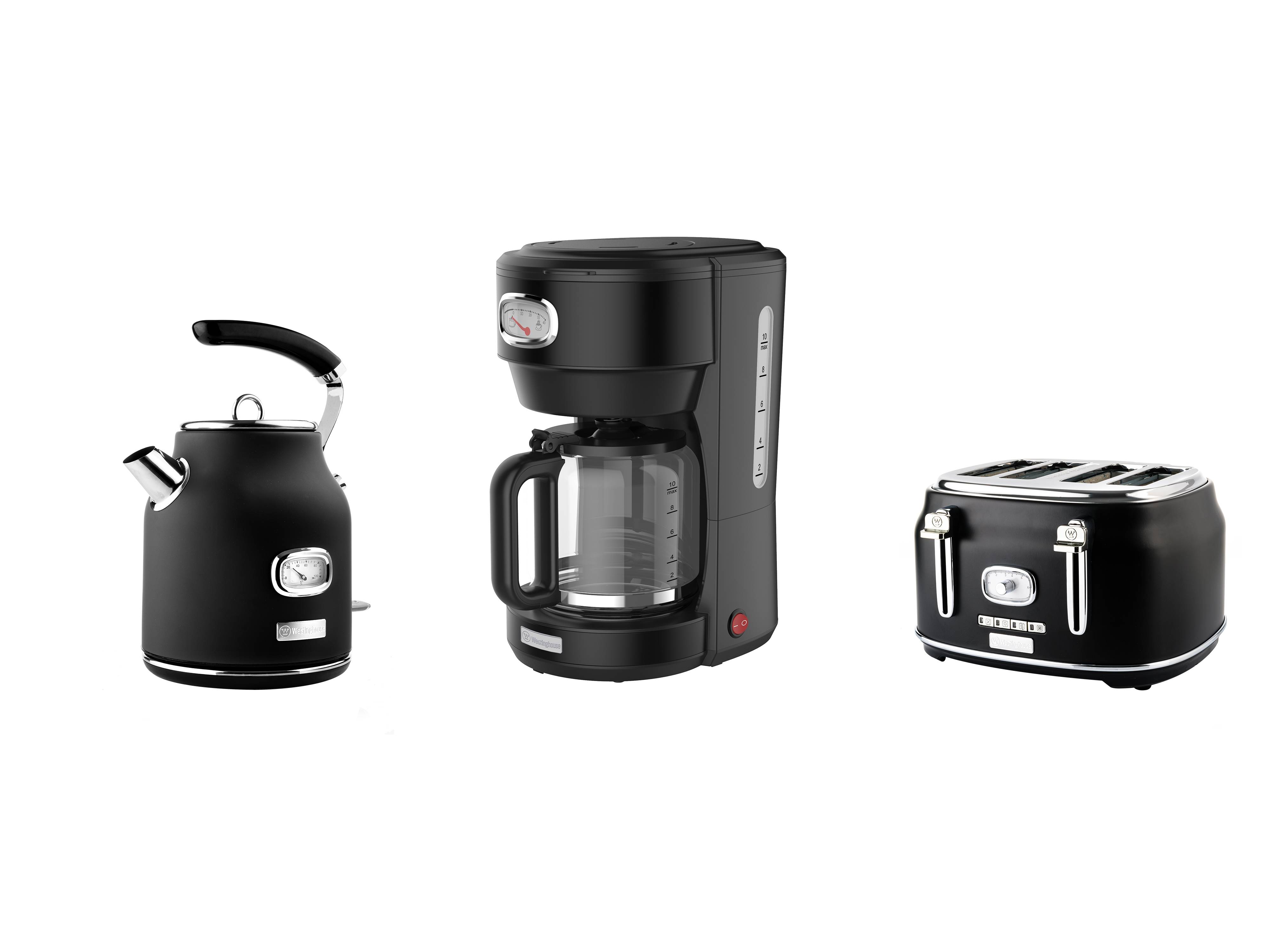 Retro Frühstücksset, 4-Schlitz Toaster + Wasserkocher 1,7L + Kaffeemaschine in schwarz