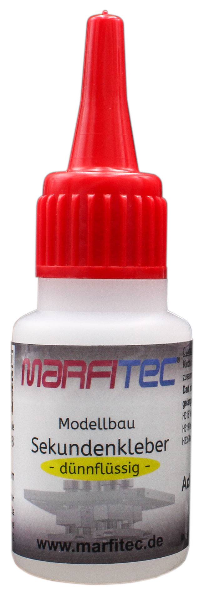 Der Marfitec Modellbau Sekundenkleber dünnflüssig mit Standard Verschluss eignet sich hervoragend zum reparieren oder dauerhaften fixieren von RC Anbauteilen. Sowie den Plastikmodellbau oder auch im Haushalt. Mit Marfitec Sekundenkleber verkleben Sie: Nach dem Auftragen die zu verklebende Oberfläche unter leichten Kontaktdruck zusammen fügen. Die Polymerisation des Klebstoffes beginnt nach wenigen Sekunden, die Werkstücke können sogleich weiter verarbeitet werden. Die optimale Umgebungstemperatur für die Verklebung liegt zwischen +20° und +25°C und bei 50-60% relativer Luftfeuchtigkeit. Bei großer Kälte kann die Aushärtegeschwindigkeit sehr langsam sein. HPDE-Behälter bieten keine vollständige Barriere. Das Produkt sollte vor direkter Sonnen- und Hitzeeinstrahlung geschützt werden. Zu starke Lichteinwirkung verfärbt das Produkt. Vor der Verarbeitung sollte das noch ungeöffnete Produkt auf Raumtemperatur gebracht werden, um die Klebekraft zu optimieren. Bei idealer Lagerung (dunkel und trocken) bis +15 °C beträgt die Haltbarkeit mindestens 12 Monate; bei normaler Lagerung zwischen +16 °C und +22 °C mindestens 6 Monate. Das Sicherheitsdatenblatt kann unter Datenblätter heruntergeladen werden. Skin Irrit. 2 Eye Irrit. 2 STOT SE 3Beschreibung: