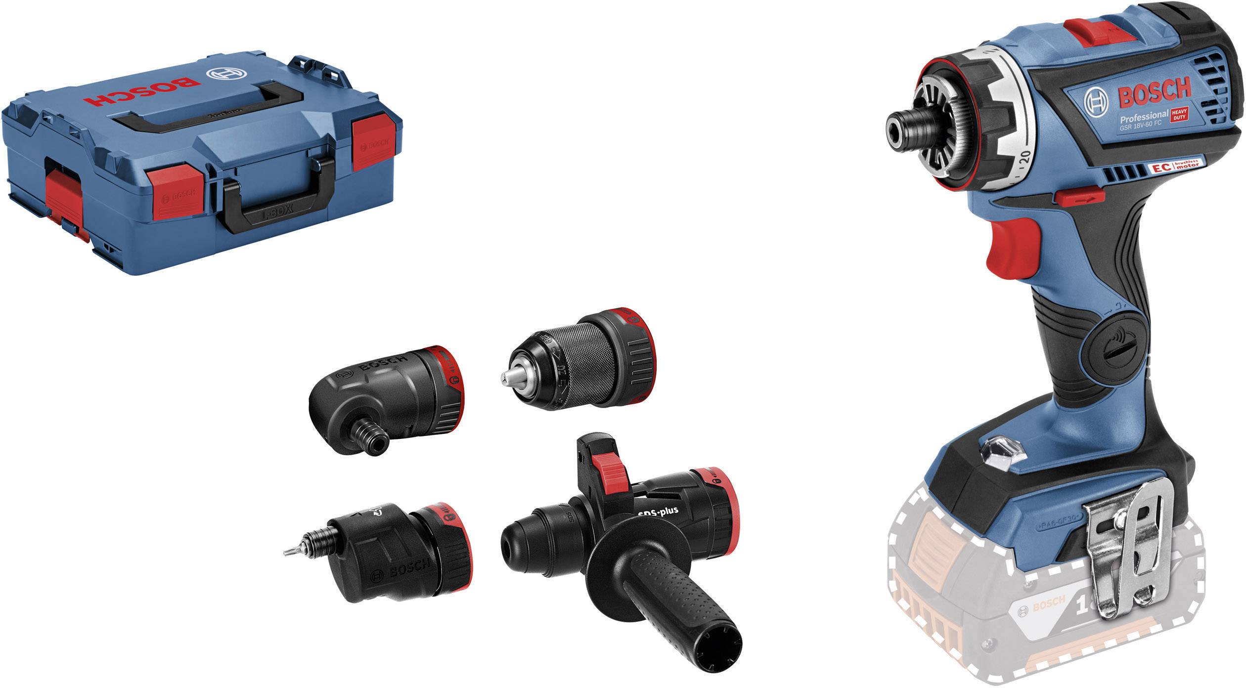 Akku-Bohrschrauber GSR 18V-60 mit bürstenlosen Motor und FlexiClick System: flexibel und vielseitig für alle Arbeiten in der 18-Volt-Klasse. Die FlexiClick-Aufsätze Zeichen sich durch einfache Bedienbarkeit aus. Die Aufsätze können in 16 verschiedenen Positionen (360°) arretiert werden, ohne sie vom Akku-Schrauber abnehmen zu müssen. Der optional erhältliche SDS Bohrhammer-Aufsatz macht aus dem Bohrschrauber einen vollwertigen Bohrhammer.