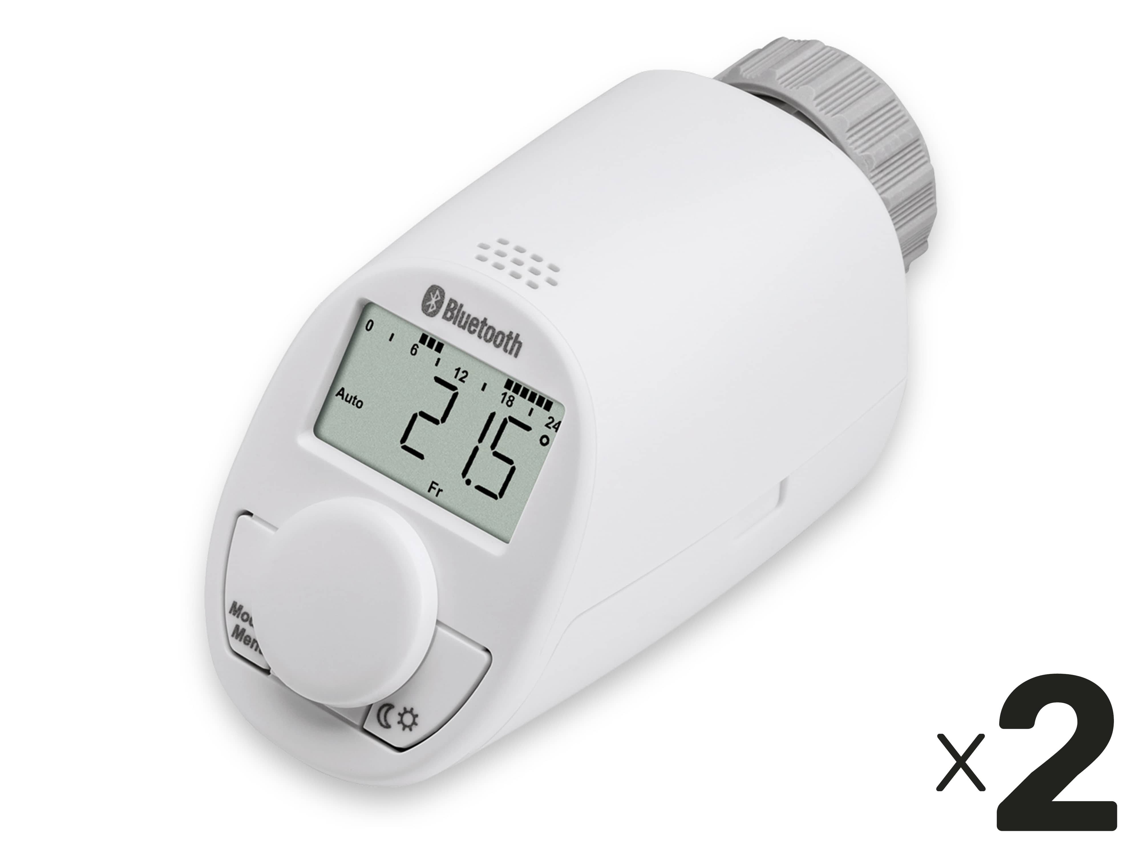 Programmierbarer Energiespar-Regler zur Steuerung der Heizung. Manuell mit den Bedientasten oder bequem per Bluetooth konfigurier- und steuerbar. Features: - Heizkörperthermostat mit Bluetooth Low Energy zum bedarfsgerechten Regulieren der Raumtemperatur- Intuitive Bedienung per kostenloser iOS und Android App - Zusätzlich jederzeit auch ohne Smartphone bedienbar - Konfiguration des Wochenprogramms erlaubt Eingabe beliebiger Temperaturverläufe mit bis zu 7 Schaltzeiten pro Tag- Boost-Funktion für schnelles, kurzzeitiges Aufheizen - Kompaktes Gerät mit besonders leisem Betrieb - Moderner Softwarealgorithmus und Präzisionsgetriebe mit mehr als 4.000 Fahrpositionen für quasi-analoge Regelung auch in Herbst/Frühjahr- In typischen Anwendungen bis zu 30 % Energie-Ersparnis - Automatische Absenkung beim Lüften spart zusätzlich Energie - Urlaubsfunktion: Die Temperatur kann bis zur Heimkehr abgesenkt werden - Frostschutz-Automatik: Kein Auskühlen eines Raumes unter 5 °C - Schutz vor Verkalkung des Ventils durch automatische Ventilfahrt - Kindersicherung/Bediensperre schützt gegen unerwünschte Änderungen - Passend für Ventile aller gängigen Hersteller - Gleichermaßen für Mieter und Eigentümer geeignet - Montage ohne Wasser abzulassen, ohne Eingriff in das Heizungssystem, kein Spezialwerkzeug erforderlich, unabhängig von der Art der Heizung Technische Daten: - Spannungversorgung: 2x Mignon-Batterie/Akku (AA), im Lieferumfang - Batterielebensdauer: 2 Jahre (typ.) - Funktechnik: Bluetooth Low Energy (2,4 GHz) - Smartphone Unterstützung: Apple (ab iOS 8.3), Android (ab Version 4.4) - Display: LCD - Gewindeanschluss: M30x1,5 mm - Kompatibel mit: - Heimeier, MNG, Honeywell-Braukmann, Oventrop, Schlösser, Comap - Valf Sanayii, Idmar, Jaga, Junkers, Pegler, R.B.M., Watts, Danfoss RA mit Adapter u.v.m.- Schutzart: IP20 - Maße (BxHxT): 55x60x102 mm - Gewicht: 160 g (inkl. Batter