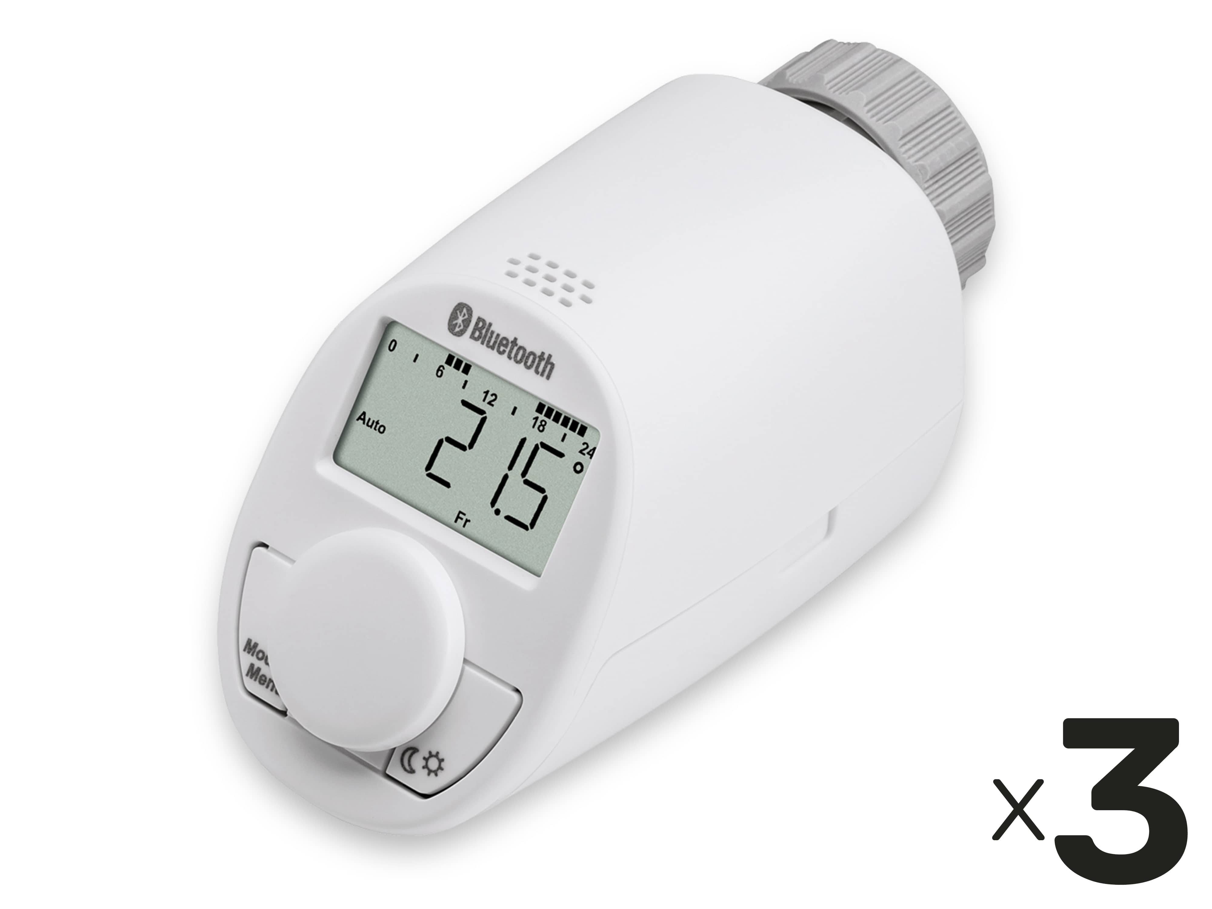Programmierbarer Energiespar-Regler zur Steuerung der Heizung. Manuell mit den Bedientasten oder bequem per Bluetooth konfigurier- und steuerbar. Features: - Heizkörperthermostat mit Bluetooth Low Energy zum bedarfsgerechten Regulieren der Raumtemperatur- Intuitive Bedienung per kostenloser iOS und Android App - Zusätzlich jederzeit auch ohne Smartphone bedienbar - Konfiguration des Wochenprogramms erlaubt Eingabe beliebiger Temperaturverläufe mit bis zu 7 Schaltzeiten pro Tag- Boost-Funktion für schnelles, kurzzeitiges Aufheizen - Kompaktes Gerät mit besonders leisem Betrieb - Moderner Softwarealgorithmus und Präzisionsgetriebe mit mehr als 4.000 Fahrpositionen für quasi-analoge Regelung auch in Herbst/Frühjahr- In typischen Anwendungen bis zu 30 % Energie-Ersparnis - Automatische Absenkung beim Lüften spart zusätzlich Energie - Urlaubsfunktion: Die Temperatur kann bis zur Heimkehr abgesenkt werden - Frostschutz-Automatik: Kein Auskühlen eines Raumes unter 5 °C - Schutz vor Verkalkung des Ventils durch automatische Ventilfahrt - Kindersicherung/Bediensperre schützt gegen unerwünschte Änderungen - Passend für Ventile aller gängigen Hersteller - Gleichermaßen für Mieter und Eigentümer geeignet - Montage ohne Wasser abzulassen, ohne Eingriff in das Heizungssystem, kein Spezialwerkzeug erforderlich, unabhängig von der Art der Heizung Technische Daten: - Spannungversorgung: 2x Mignon-Batterie/Akku (AA), im Lieferumfang - Batterielebensdauer: 2 Jahre (typ.) - Funktechnik: Bluetooth Low Energy (2,4 GHz) - Smartphone Unterstützung: Apple (ab iOS 8.3), Android (ab Version 4.4) - Display: LCD - Gewindeanschluss: M30x1,5 mm - Kompatibel mit: - Heimeier, MNG, Honeywell-Braukmann, Oventrop, Schlösser, Comap - Valf Sanayii, Idmar, Jaga, Junkers, Pegler, R.B.M., Watts, Danfoss RA mit Adapter u.v.m.- Schutzart: IP20 - Maße (BxHxT): 55x60x102 mm - Gewicht: 160 g (inkl. Batter