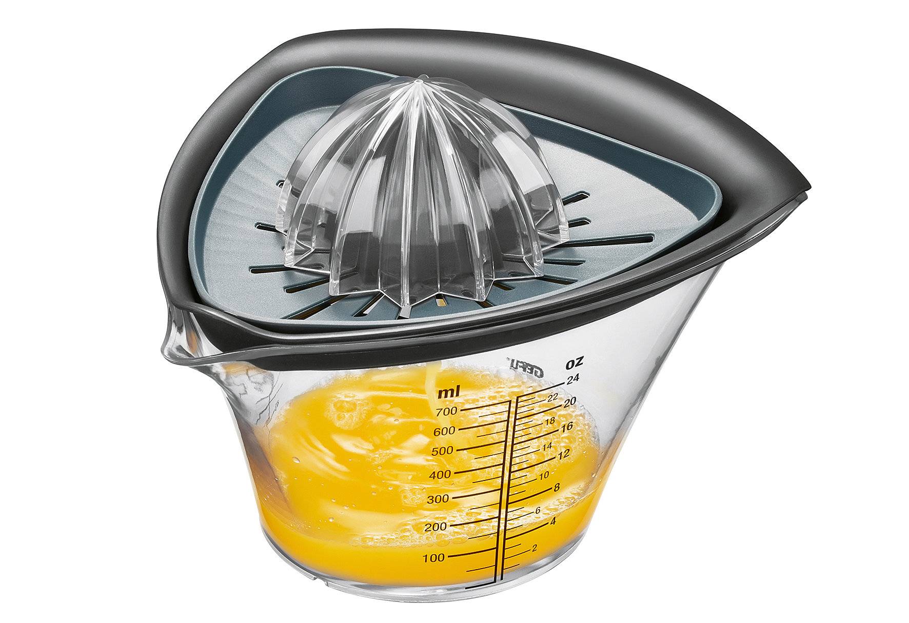 SKALIERUNG: der Kunststoffbehälter ist mit einer leicht ablesbaren Skalierung in den Einheiten ml und oz bedruckt. Dadurch ist der Entsafter auch als Messbecher nutzbar