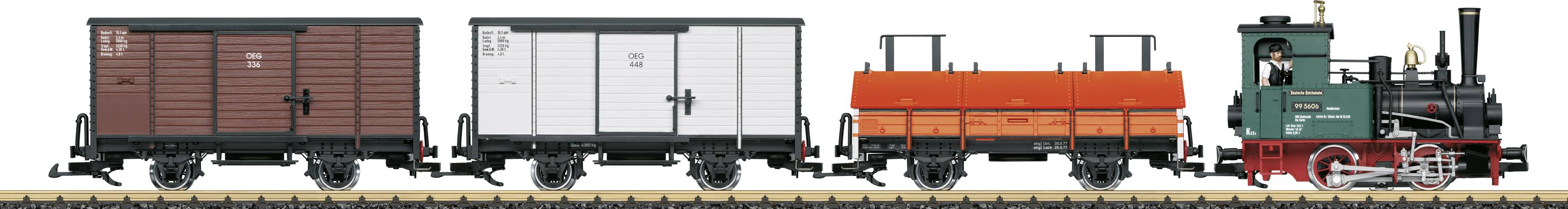 Modell des sogenannten "Fabrikzuges", wie er lange Jahre vor dem Nürnberger LGB - Werk in der Saganer Strasse in Nürnberg gestanden hat. Der Zug besteht aus der Dampflok 99 5606 in originalgetreuer Farbgebung und Beschriftung der 70er Jahre. Lokschilder als Ätzteile separat angesetzt. Ausgerüstet mit einem leistungssarken kugelgelagerten Bühler-Motor und mfx/DCC - Decoder mit vielen digital schaltbaren Funktionen und Sounds. Eingebauter Rauchgenerator mit radsynchronem Dampfausstoss. Digital schaltbares Spitzenlicht mit der Fahrtrichtung wechselnd, im Analogbetrieb eingeschaltet. Digital schaltbare Führerstandsbeleuchtung. Das Fahrgeräusch ist im Analogbetrieb funktionsfähig. Zweiachsiger Klappdeckelwagen in originalgetreuer Farbgebung und Beschriftung der 70er Jahre. Separat angesetztes Bremsrad der Handbremse. Zweiachsiger gedeckter Güterwagen 448 in originalgetreuer weisser Farbgebung und Beschriftung der 70er Jahre. Separat eingesetztes Bremsrad der Handbremse, vorbildgetreue Anordnung der Bremsbacken nur auf der Innenseite der Räder. Zweiachsiger gedeckter Güterwagen 336 in originalgetreuer brauner Farbgebung und Beschriftung der 70er Jahre. Separat eingesetztes Bremsrad der Handbremse, vorbildgetreue Anordnung der Bremsbacken nur auf der Innenseite der Räder. Gesamtlänge des Zuges 115 cm.
