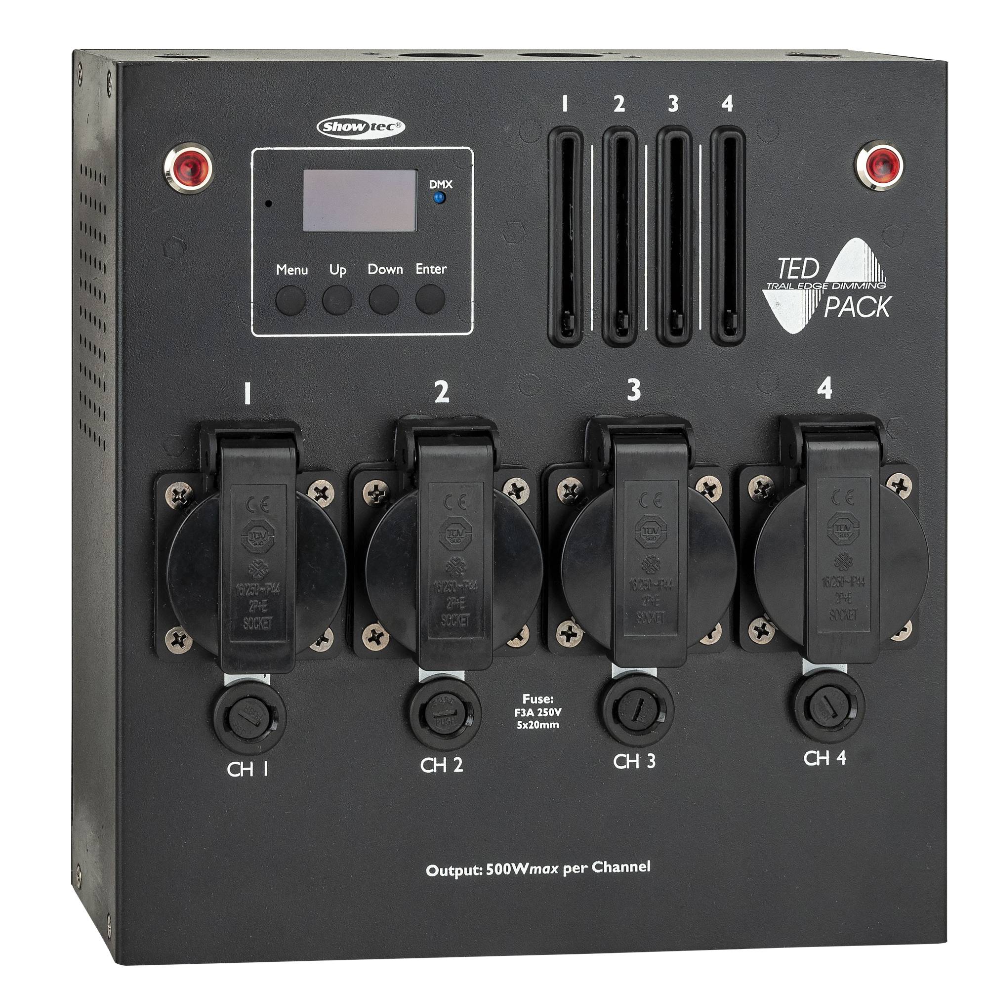 Der TED Pack LC ist ein 2000 W leading und trailing edge 4-Kanal Dimmer mit eingebauten Steuerfadern für den Innenbereich mit Dimm-, Schalt- und FX-Modus. Die Leistung ist unabhängig von der angeschlossenen Last und kann mit LEDs und Glühbirnen bis zu 2 A pro Kanal genutzt werden. Die Kanäle können miteinander verbunden oder einzeln gesteuert werden. Das TED Pack LC verwendet MOSFETs zum Dimmen des Ausgangs und kann zwischen leading edge und trailing edge dimming umgeschaltet werden. Der Special FX-Modus bietet einen Sicherheitskanal, der ein unbeabsichtigtes Einschalten verhindert, was bei der Steuerung von Schützen, Kanonen, Drops etc. hilfreich sein kann. Das Gerät kann manuell, über die eingebauten Fader und über DMX gesteuert werden. Die mitgelieferte Quicklock-Halterung lässt sich einfach von hinten oder von oben anklicken.