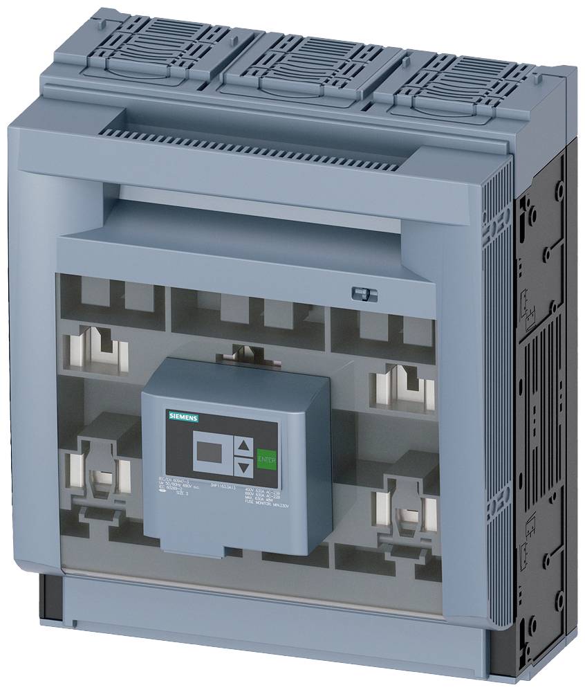 SENTRON, Sicherungslasttrennschalter 3NP1, 3-polig, NH3, 630 A, für Aufbau und Einbau auf Montageplatte, Flachanschluss, Sicherungsüberwachung: elektronisch EFM20, Abdeckebene 70mm Sicherungslasttrennschalter 3NP bis 630 A mit verbessertem Personen- und Anlagenschutz und komfortabler Anschlusstechnik. Die Sicherungslasttrennschalter bewahren Anlagen in Industrie oder Infrastruktur vor Überlast und Kurzschluss und sind für den branchenübergreifenden Einsatz geeignet. Der standardmäßig enthaltene Umgreif- und Berührungsschutz der neuen Sentron-Reihe 3NP1 verhindert dass der Anwender bei der Montage von Sammelschienensystemen stromführende Teile berührt, selbst bei rückseitigem Zugriff.Zusätzlich kann der Anwender kann durch die großen Sichtfenster leicht die eingesetzten Sicherungen erkennen. Die Siemens Sicherungslasttrennschalter 3NP zeichnen sich vor allem aus durch: 1. Höchst flexibel durch modularen Aufbau und durchgängiges Zubehör. 2. Geeignet für Bodenbefestigung, Hutschiene, und Siemens Sammelschienensystem 8US 3. Elektronische Sicherungsüberwachungsfunktion inkl. Netzüberwachung. 4. Fünf Baugrößen von 100 A bis 630 A bis Schutzart IP40. 5. Schneller und sicherer Umbau für Kabelabgang oben / unten. 6. Flexible Schaltzeitpunkte des Hilfsschalters möglich (gleichzeitig oder voreilend). 7. Möglichkeit zum Abschließen und Plombieren.