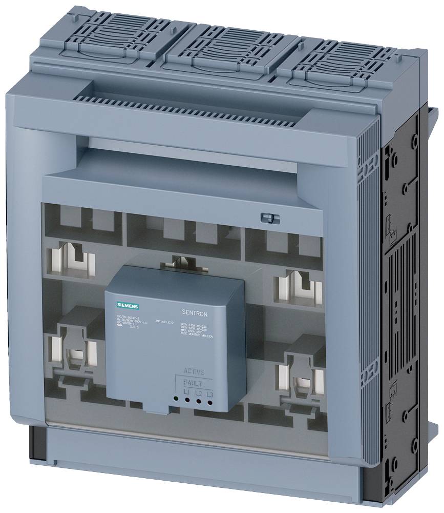 SENTRON, Sicherungslasttrennschalter 3NP1, 3-polig, NH3, 630 A, für Sammelschienensystem Rittal 60mm, Flachanschluss, Sicherungsüberwachung: elektronisch EFM10, Abdeckebene 32/70mm Sicherungslasttrennschalter 3NP bis 630 A mit verbessertem Personen- und Anlagenschutz und komfortabler Anschlusstechnik. Die Sicherungslasttrennschalter bewahren Anlagen in Industrie oder Infrastruktur vor Überlast und Kurzschluss und sind für den branchenübergreifenden Einsatz geeignet. Der standardmäßig enthaltene Umgreif- und Berührungsschutz der neuen Sentron-Reihe 3NP1 verhindert dass der Anwender bei der Montage von Sammelschienensystemen stromführende Teile berührt, selbst bei rückseitigem Zugriff.Zusätzlich kann der Anwender kann durch die großen Sichtfenster leicht die eingesetzten Sicherungen erkennen. Die Siemens Sicherungslasttrennschalter 3NP zeichnen sich vor allem aus durch: 1. Höchst flexibel durch modularen Aufbau und durchgängiges Zubehör. 2. Geeignet für Bodenbefestigung, Hutschiene, und Siemens Sammelschienensystem 8US 3. Elektronische Sicherungsüberwachungsfunktion inkl. Netzüberwachung. 4. Fünf Baugrößen von 100 A bis 630 A bis Schutzart IP40. 5. Schneller und sicherer Umbau für Kabelabgang oben / unten. 6. Flexible Schaltzeitpunkte des Hilfsschalters möglich (gleichzeitig oder voreilend). 7. Möglichkeit zum Abschließen und Plombieren.