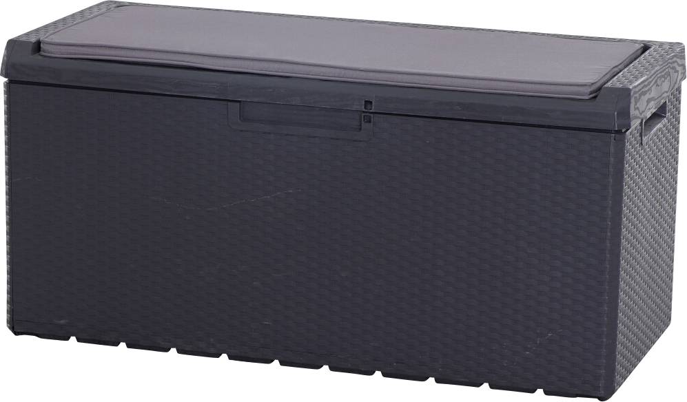 Kissenbox Portonovo, 350 Liter, Gestell aus Kunststoff in anthrazit, Flächen aus Polypropylen in anthrazit, mit 2 Griffen für einfaches Handling, inklusive Rollen für den einfachen Transport, mit Gasdruckfedern unterstützter Öffnungsmechanismus des Deckels für einfaches Öffnen und Schließen, praktische Sitzfunktion für zwei Erwachsene, mit Sitzkissen, 4 Rollen