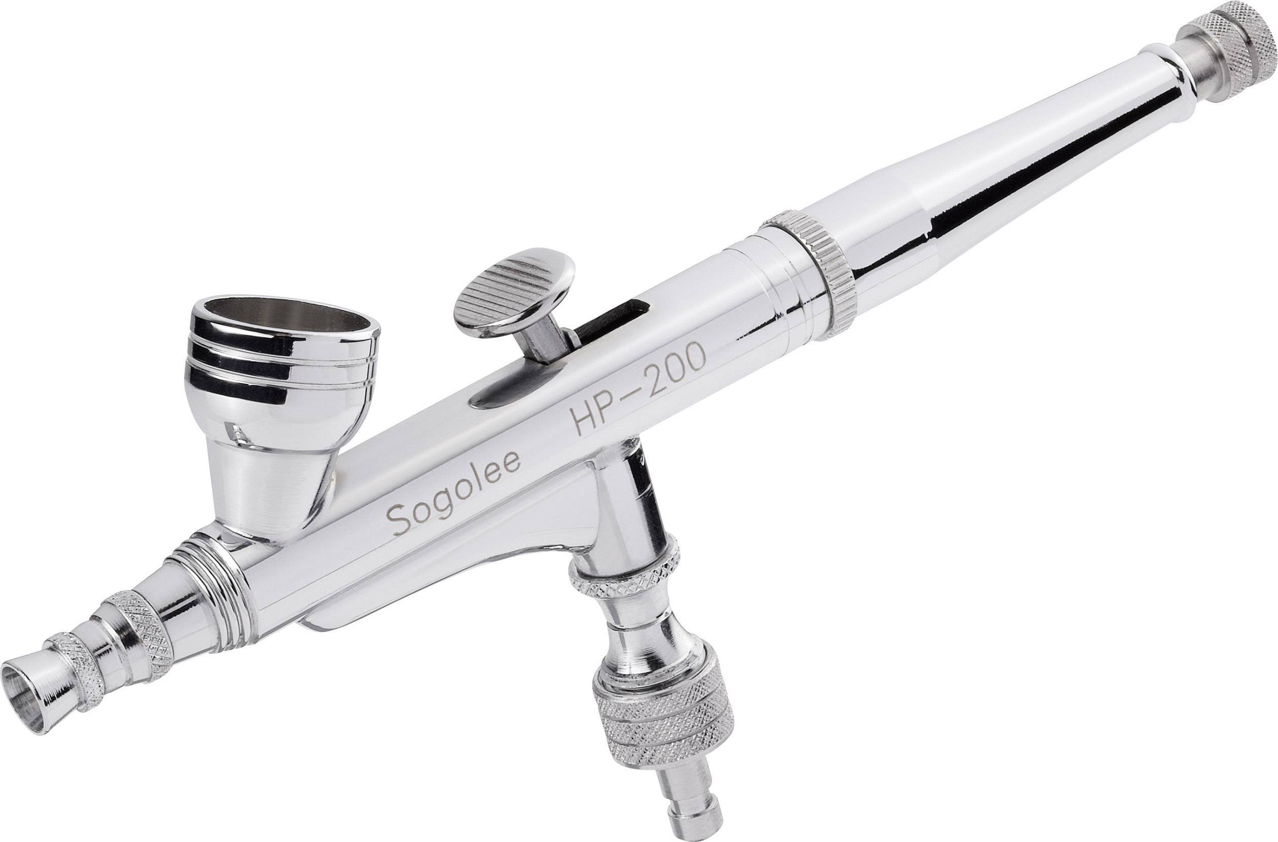 Die Spritzpistole HP 200 ist ein für den professionellen Einsatz konzipiertes Gerät mit Double-Action-Funktion. Die gewünschte Farb-Durchflussmenge kann mit Hilfe der Justierschraube am Ende des Griffstückes auch während des Sprühvorganges eingestellt werden. Die Pistole ist mit einer 0,2 mm Düse ausgestattet und eignet sich daher für feinste Detailarbeiten.
