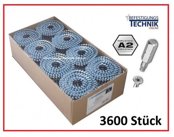 Nagelschrauben wurden für alle herkömmliche pneumatische Streifen- und Coilnagler entwickelt. Sie werden, wie Nägel, mit einem Schlag eingetrieben und lassen sich bei Bedarf mit Hilfe eines Akkuschrauber nachjustieren oder herausschrauben. Dadurch werden Sie gerne bei Vielzahl von Anwendungen verbarbeitet, bei welches schnelles und zerstörungsfreies Entfernung von Holzverbindungen erforderlich ist (z.B. Unterkonstruktionen im Messebau, Schalungen im Bauhandwerk, temporäre Umzäunungen und die unterschiedlichen Holzkisten und -paletten für Verpackungs- und Transportzwecke). Mit Nagelschrauben arbeiten Sie bis zu 8x schneller als mit losen Schrauben oder sogar magazinierten Schrauben, denn die Nagelschrauben lassen sich so schnell wie Nägel verarbeiten. Darüberhinaus haben Sie deutlich bessere Haltekraft als ein Nagel. Verpackungseinheit 3600 Stück