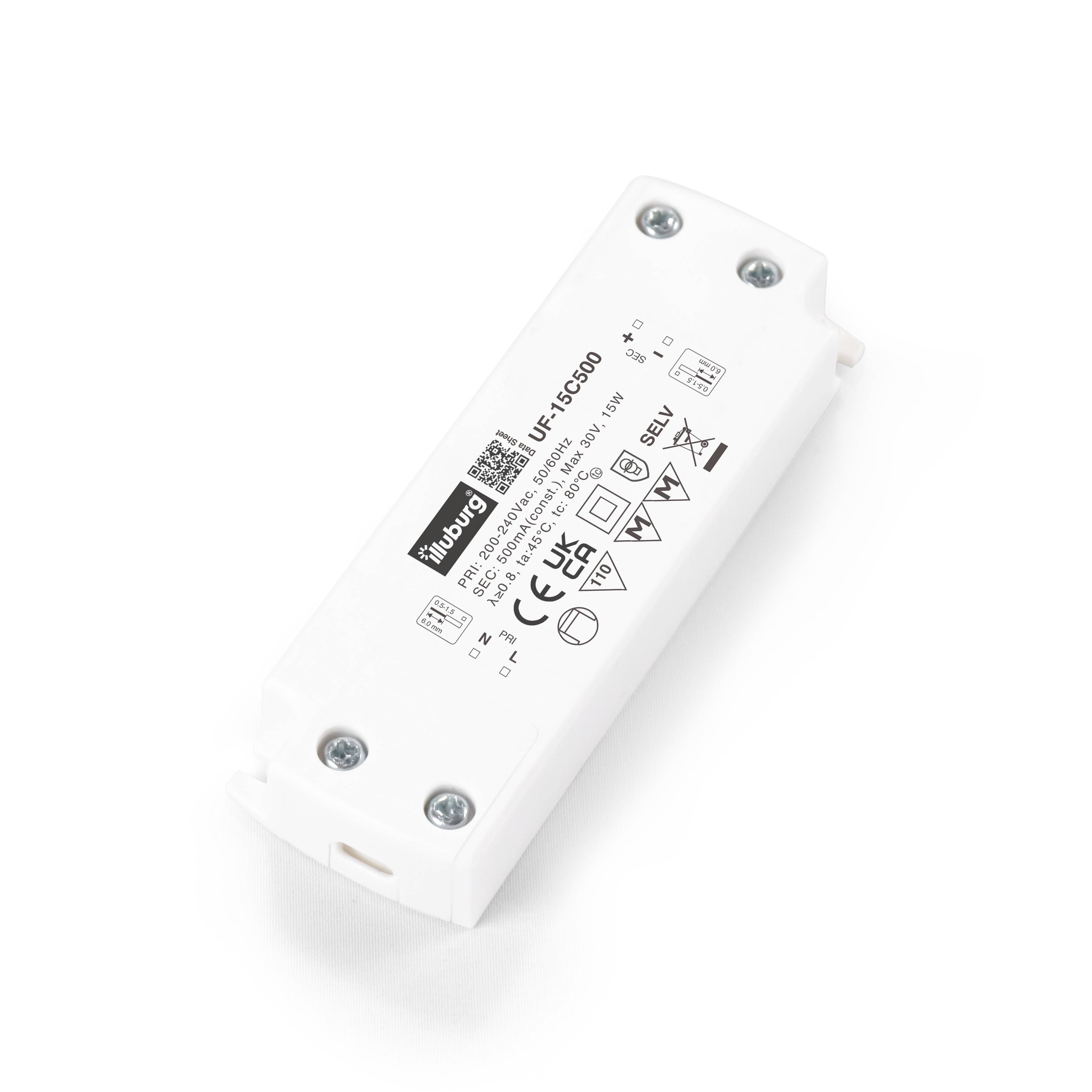 LED-TREIBER UF-15C500: Eingang 200 - 240 V (AC), Ausgang 500 mA Kosntantstrom mit Spannungsbereich 15 - 30 V (DC), nicht dimmbar, unabhängige Installation.