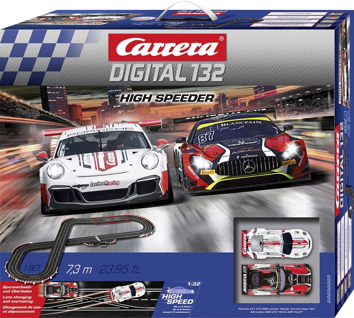 Ausdauer ist gefragt, wenn sich diese Supersportwagen auf der Langstrecke zum Kräftemessen treffen. Die beiden GT Boliden, der Mercedes AMG GT3 „AKKA ASP, No.87“ und der Porsche 911 GT3 RSR Lechner Racing „Carrera Race Taxi“ haben es in sich und verlangen von ihren Piloten am Handregler vollen Einsatz. Spektakuläre Aufholjagden mit dem stylischen „Carrera Race Taxi“ von Porsche lassen die Herzen der Motorsport-Fans höher schlagen, doch auch der Mercedes kann seine über 500 PS rasant auf die Straße bringen. Die 7,3 Meter reichen den beiden High-Speedern vollkommen aus, um ihr Potential zu entfalten. Rennspaß pur ist mit dem Carrera DIGITAL 132-Set „High Speeder“ garantiert.
