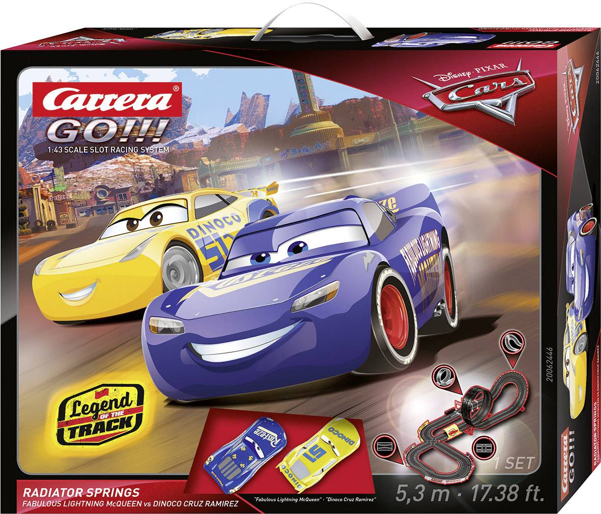 Nach dem großen Erfolg des dritten Films der beliebten Disney•Pixar Cars Reihe feiern neue Sets zu den Leinwandabenteuern auch ihr Debüt auf der Carrera GO!!! Rennbahn. Im Set „Disney•Pixar Cars - Radiator Springs“ präsentiert sich der Kinoheld Lightning McQueen neuerdings in blauer Lackierung als „Fabulous Lightning McQueen“ und sieht sich mit seiner ehemaligen Trainerin Cruz Ramirez konfrontiert, die in der gelben Lackierung ihres neuen Sponsors, dem Ölunternehmen Dinoco, als „Dinoco Cruz“ antritt. Auf der 5,3 Meter langen Carrera Autorennbahn mit Looping und Fly-Over sind endlose Rennabenteuer vorprogrammiert.