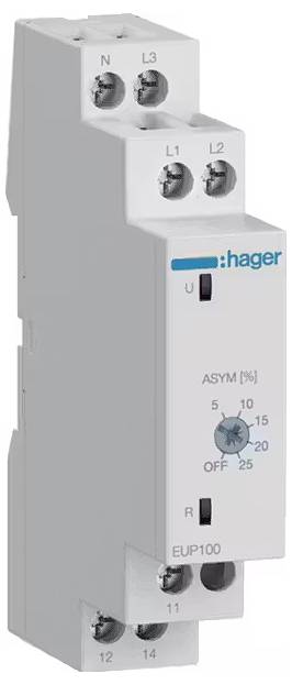Kontrollrelais Phasenüberwachung 3P(N) 1 Wechsler.Kontroll- und Überwachungsrelais für Dreiphasennetzen (3P, 3P+N). Einstellbare Überwachung von Asymmetrie. Auslösung bei Phasenausfall und falscher Phasenfolge. Signalisierung über Wechslerkontakt und LEDs. Montage auf Hutschiene (DIN-Schiene).
