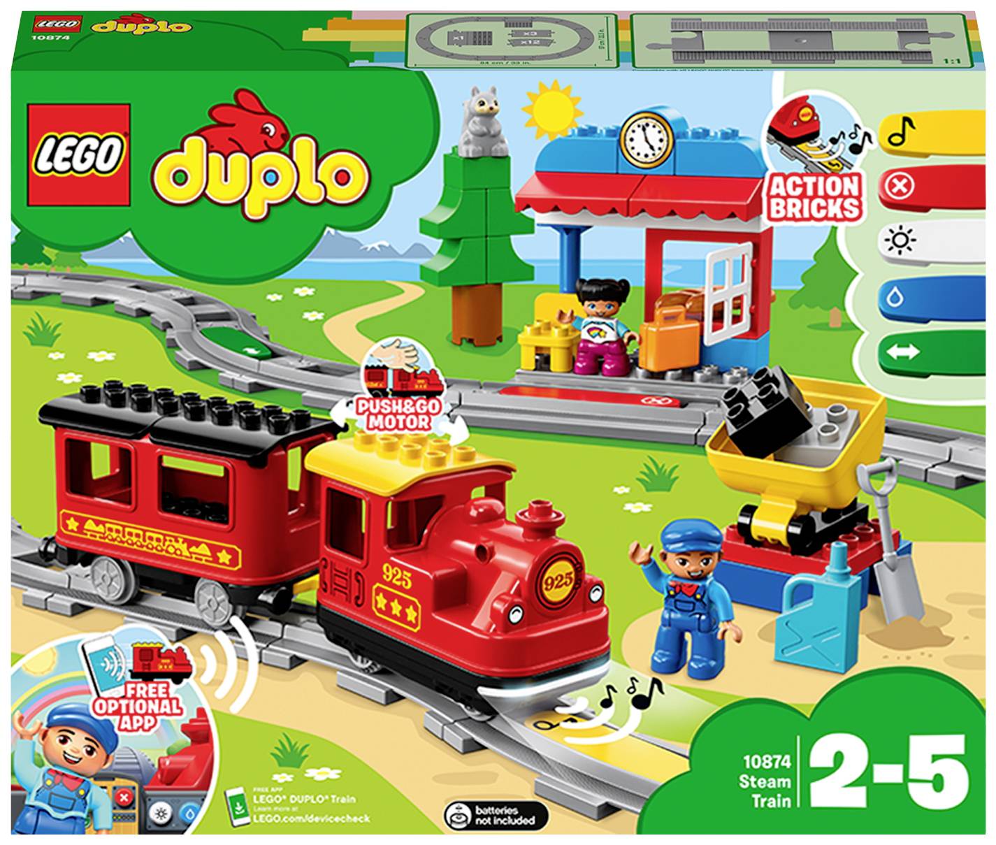 Das LEGO® DUPLO® Set „Dampfeisenbahn“ (10874) lässt sich jetzt noch leichter von Kleinkindern steuern und bietet ihnen verschiedene Interaktionsmöglichkeiten. Kleine Kinder verwandeln sich in Lokführer – mithilfe des „Push & Go“-Motors. Durch sanftes Anschieben fährt der Zug vorwärts oder rückwärts. Wird er dann festgehalten oder von den Schienen gehoben, stoppt der Motor. Die 5 farbigen Funktionssteine können entlang der Gleise platziert werden, um ein Signal ertönen zu lassen, die Lichter ein- und auszuschalten, die Fahrtrichtung zu ändern oder den Zug zu betanken und überall anzuhalten. Dieses LEGO DUPLO Set enthält einen Bahnhof, einen Kohlekipper, 2 DUPLO Figuren sowie eine Tierfigur und eine einfache Spielzeugeisenbahnstrecke, damit Vorschulkinder Spielspaß mit einer klassischen Spielzeugeisenbahn erleben können. Mit der optionalen App erhält man noch mehr Spielmöglichkeiten. Hierzu zählen eine Fernsteuerungsfunktion und lustige Aktivitäten für gemeinsamen Spielspaß mit dem Kleinkind!