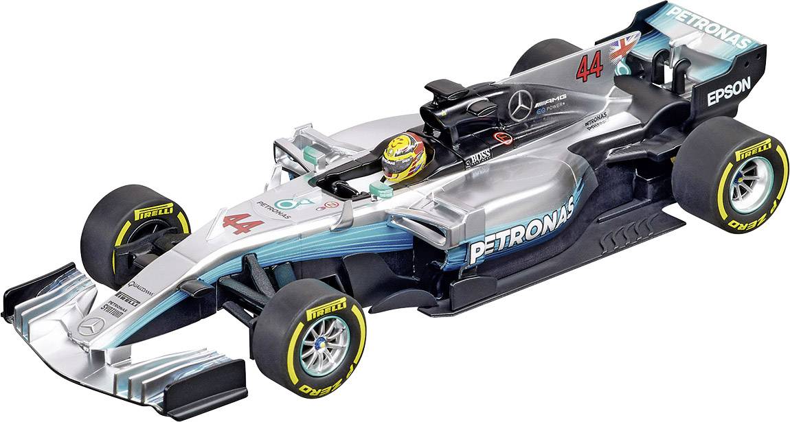 Der viermalige Weltmeister Lews Hamilton zeigt im Mercedes-Benz F1 W08 wieder sein ganzes Können! In seinem schnittigen Formel-1-Wagen konnte er zuletzt bei der Weltmeisterschaft 2017 den Titel einheimsen und die Saison vorzeitig für sich entscheiden. Seine Gegner auf der Rennstrecke wissen, dass hier ein starker Kontrahent darauf wartet, sie zu besiegen. Doch nicht nur Tempo, sondern auch Geschick am Handregler wird von den zukünftigen Carrera Champions erwartet, wenn sie mit dem originalgetreuen Siegerfahrzeug um die Kurven düsen. Das Carrera Auto ist individuell codierbar, digital steuerbar und bietet echten Fahrspaß.