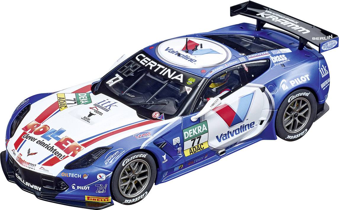 Als Nachfolgemodell der Corvette C6.R musste die Chevrolet Corvette C7.R in große Fußstapfen treten. Und das schaffte sie auch! Der Rennwagen fuhr unter dem Team "Callaway Competition" bei dem Rennen "ADAC GT Masters 2017" als Sieger ins Ziel. Mit Jules Gounon am Steuer, der schon einige Erfolge zu verbuchen hat, zeigte die Chevrolet Corvette C7.R Callaway Competition "No. 77" im niederländischen Zandvoort, was für einen guten Job Chevrolet bei der Überarbeitung des Rennmodells gemacht hat. Im Design von Roller und Valvoline ist die Corvette dabei auch noch ein echter Blickfang. Das Gesamtpaket stimmt einfach! Die Chevrolet Corvette C7.R Callaway Competition "No. 77" ist ausgestattet mit Frontlicht und Rück-/ Bremslicht und beeindruckt durch die originalgetreue Verarbeitung. Das Carrera Fahrzeug ist individuell codierbar, digital steuerbar sowie auch analog (Carrera Exclusiv) einsetzbar. Einfach authentisches Rennfeeling für zu Hause.
