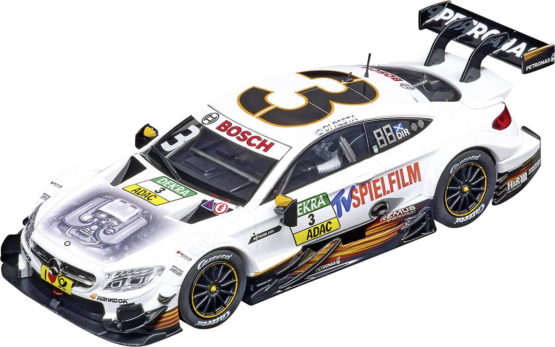 Paul Di Resta zeichnet sich nicht nur durch seine Technik auf der Fahrbahn aus, sondern auch durch seine Spontanität und Lockerheit. Diese legte er auch an den Tag, als er kurzfristig für einen erkrankten Teamkollegen einspringen musste. Nur wenige Stunden vor Rennbeginn bekam er über seinen Einsatz Bescheid. Dennoch nahm er dies gelassen und mit Humor. Diese Attribute helfen ihm nun auch im Mercedes-AMG C 63 DTM, denn auch auf der Rennstrecke kann es vorkommen, dass nicht immer alles nach Plan läuft. Dann ist eine schnelle Reaktion gefragt und die Nerven müssen behalten werden. Der neu entwickelte Rennwagen von Mercedes hilft di Resta dabei, dies zu schaffen und die Rennen für sich zu gewinnen. Der Mercedes-AMG C 63 DTM "P. Di Resta, No.3" ist ausgestattet mit Frontlicht und Rück-/ Bremslicht und beeindruckt durch die originalgetreue Verarbeitung. Das Carrera Auto ist individuell codierbar, digital steuerbar und bietet echten Fahrspaß.