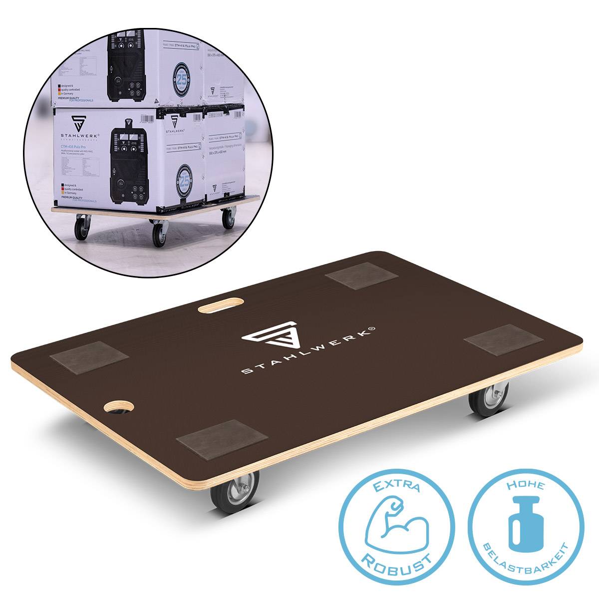 - Darüber hinaus besitzt das Rollbrett neben einer rutschfesten Beschichtung praktische Gummi-Pads, die festen Halt bieten und ein Verrutschen der Ladung verhindern.