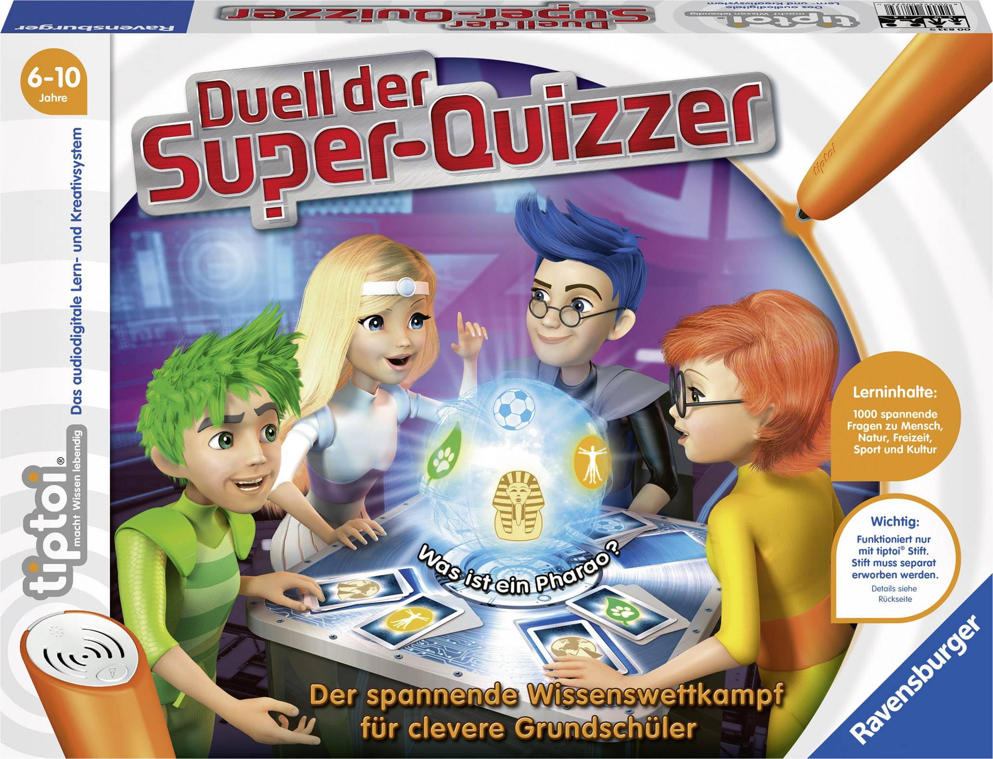 tiptoi® stellt die Fragen und führt durch das Spiel Was misst man mit einem Thermometer? In welchem Land stehen die Pyramiden von Gizeh? Stimmt es, dass Fische mit Kiemen atmen? Die kindlichen Superhelden treten im Wissensduell in der Arena der Super-Quizzer an. In den verschiedenen Kategorien Lebenswelt, Natur, Geschichte und Geografie, Sport, Mensch und Körper messen sich die Spieler und gewinnen Karten. tiptoi® stellt Fragen und führt durch das Spiel. Im Finale zeigt sich, welcher Spieler mit seinem Allgemeinwissen die Arena erobert.