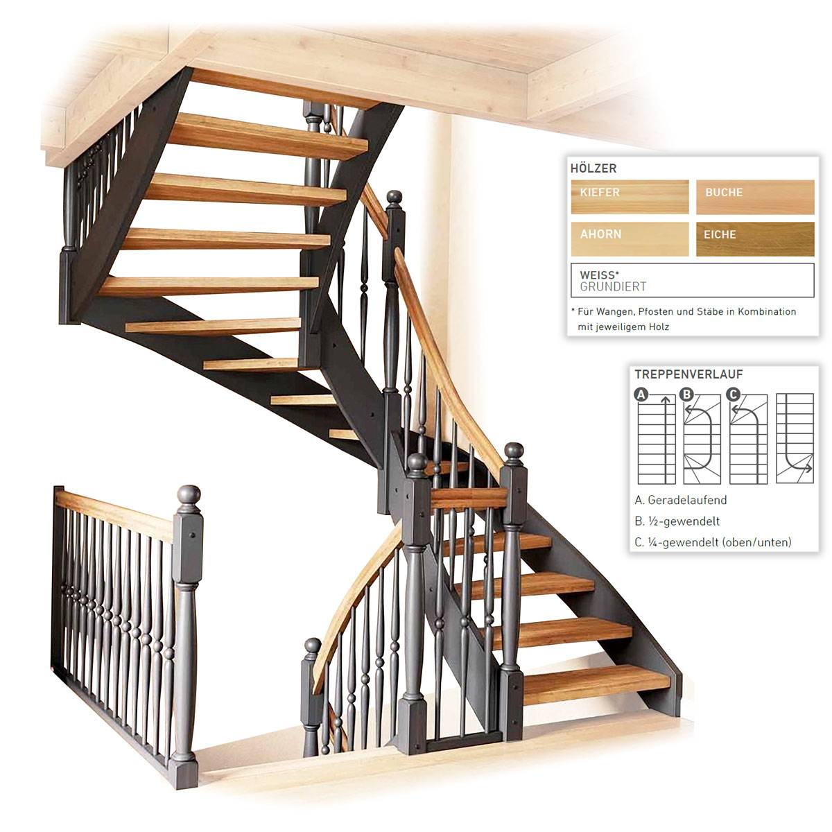 Die Treppe für Landhausliebhaber und Romantiker! Die massive Holzwangentreppe wird auf Maß gefertigt und lässt in puncto Holzauswahl, Design, Verarbeitung und Lebensdauer keine Wünsche offen. Ausgewählte Hölzer, zwei formschöne Geländervarianten und erstklassige Verarbeitung machen die DOLLE Estoril zu einem echten Glanzstück in jedem Wohnraum. Dieser Klassiker unter den Treppen begleitet Sie lange. Die Geschosstreppe wird individuell nach Maß gefertigt und ist auch als Sonderanfertigung mit schrägem Wangenverlauf oder als Podesttreppe erhältlich. Dadurch eignet sie sich zum Beispiel perfekt als mehrgeschossige Treppe, die einen einheitlichen Raumeindruck vermittelt. Für kleinere Räume kann sie ebenso als Nebentreppe angefertigt werden.Ausgelegt ist sie für eine Geschosshöhe bis zu 320 cm. Bei den Holzarten besteht die Auswahl zwischen Buche, Kiefer, Ahorn, Eiche, Esche sowie zwischen Buche gebeizt im Farbton Kirsche oder Walnuss (gebeizt, versiegelt). Bei den Ausführungen in Buche, Eiche, Esche und Ahorn können Sie die Wangen, Stäbe und Pfosten auch in Weiß oder Anthrazit grundiert wählen. Beim Geländer wurde auf eine besondere Detailgestaltung Wert gelegt. Die Holzstäbe bestechen durch ihre klassisch gedrechselte Form. Zwei Variationen stehen zur Auswahl: gedrechselt mit mittig platzierter Kugel oder gedrechselt mit kleinen Verzierungen am Stab. Dazu passen die ebenfalls gedrechselten Pfosten. Zwischen ihnen bildet der profilierte Handlauf ein dezentes gestalterisches Gegengewicht. Dieses Zusammenspiel aus weichen geschwungenen und geraden Linien gibt der DOLLE Estoril eine leicht verspielte Note. Für Liebhaber des romantischen Landhausstils lässt sie mit ihren hochwertig gedrechselten Details Erinnerungen an historische Einrichtungsvorbilder wach werden. Durch die vielfältigen Holzkombinationen können Sie der DOLLE Estoril aber auch stets eine moderne Anmutung geben, beispielsweise in der Kombination von hellem Holz mit anthrazitfarbenen Wangen. Massive Holzwangentreppe Geschosshöhe von maximal 320 cm (als Haupttreppe) Treppe nach Maß Auch als Nebentreppe möglich ACHTUNG! Genaue Maßangaben bei Bestellung erforderlich! Bitte ergänzen Sie die Angaben im Bestellformular, damit Ihre Treppe wunschgemäß angefertigt werden kann. Benötigen Sie Hilfe beim Ausmessen? Fragen Sie uns! Wir unterbreiten Ihnen gerne ein Angebot inklusive Termin vor Ort. Die Basisausführung kann mit Zubehör noch weiter an Ihre Wünsche angepasst werden. Gegen Aufpreis sind beispielsweise Setzstufen zum Verdecken von Kellerabgängen oder Abstellräumen, ein passendes Brüstungsgeländer oder eine Deckenlochverkleidung erhältlich. Kinderschutzleisten (Baurechtsleisten), aufgesattelte Antrittsstufe sowie ein Wandhandlauf mit Handlaufhaltern geben zusätzliche Sicherheit bei der Treppennutzung. Baurechtliche Kategorie: Notwendige Treppe, auch als Nebentreppe erhältlich Lieferumfang ... 1 Geländer, innen liegend Einbauanleitung