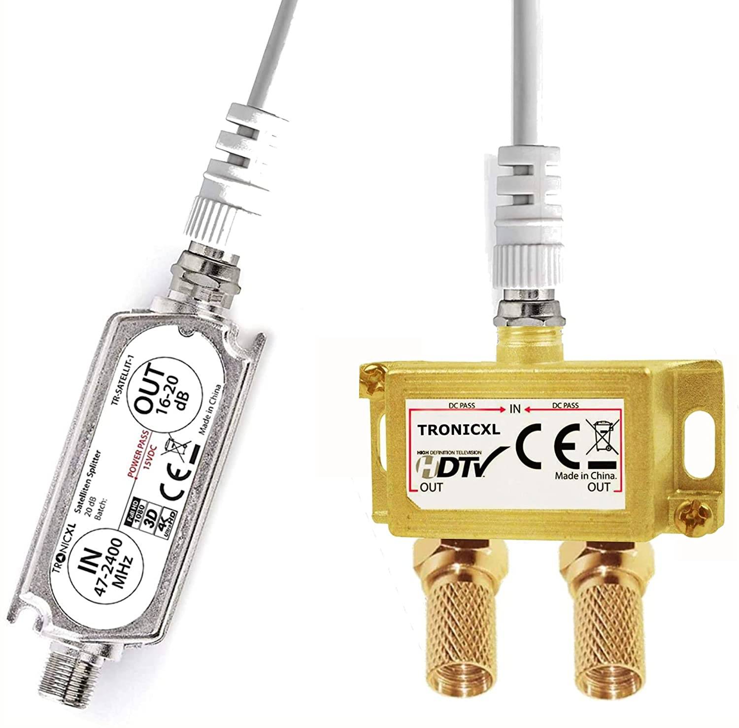Splittung des Signals eines TV Kabels auf zwei Signale mit Verstärker (20dB) für Sat (DVBS) und Antenne (DVBT). Perfekter Signalfluss durch hochwertige Komponenten.