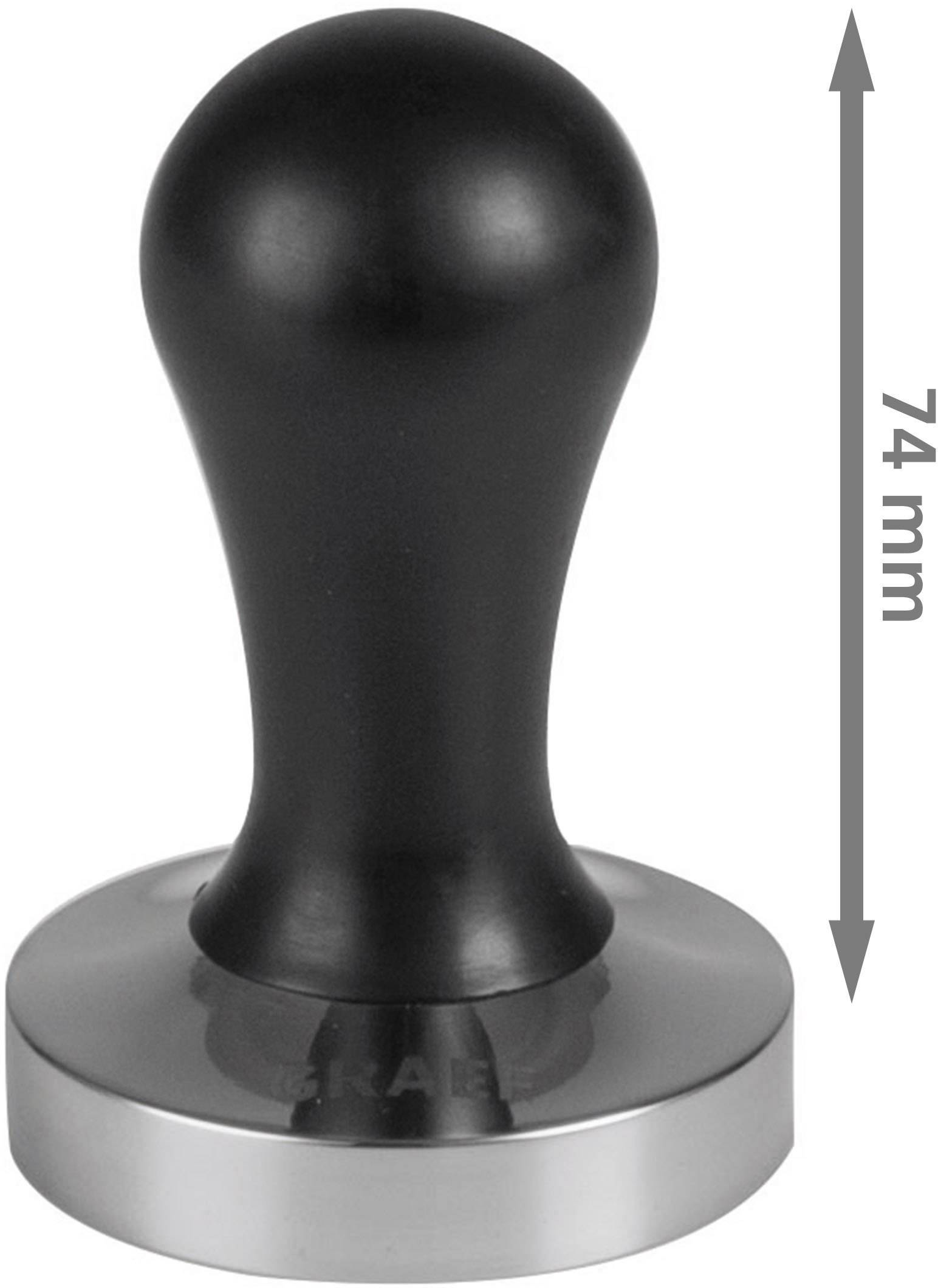 Der ergonomische Griff aus schwarz lackierten Aluminium hat eine Griffhöhe von 74 mm (Gesamthöhe des Tampers: 89,6mm) und bietet optimale Griffigkeit für normalgroße Hände.