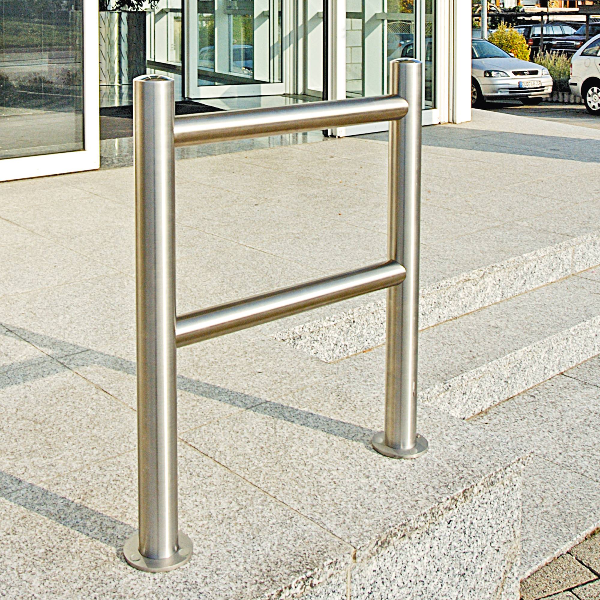 Das optisch ansprechende und gestalterisch wirksame Geländer-Element BERLIN trennt Lauf- und Verkehrswege und übernimmt zugleich eine Schutzfunktion für Fußgänger und Radfahrer. Elegante Optik durch Edelstahl mit gebürsteten Pfostenkappen.Ideal kombinierbar mit Edelstahlpollern, z.B. CITY-Poller BERLIN. Zum Aufdübeln mit Bodenplatte.