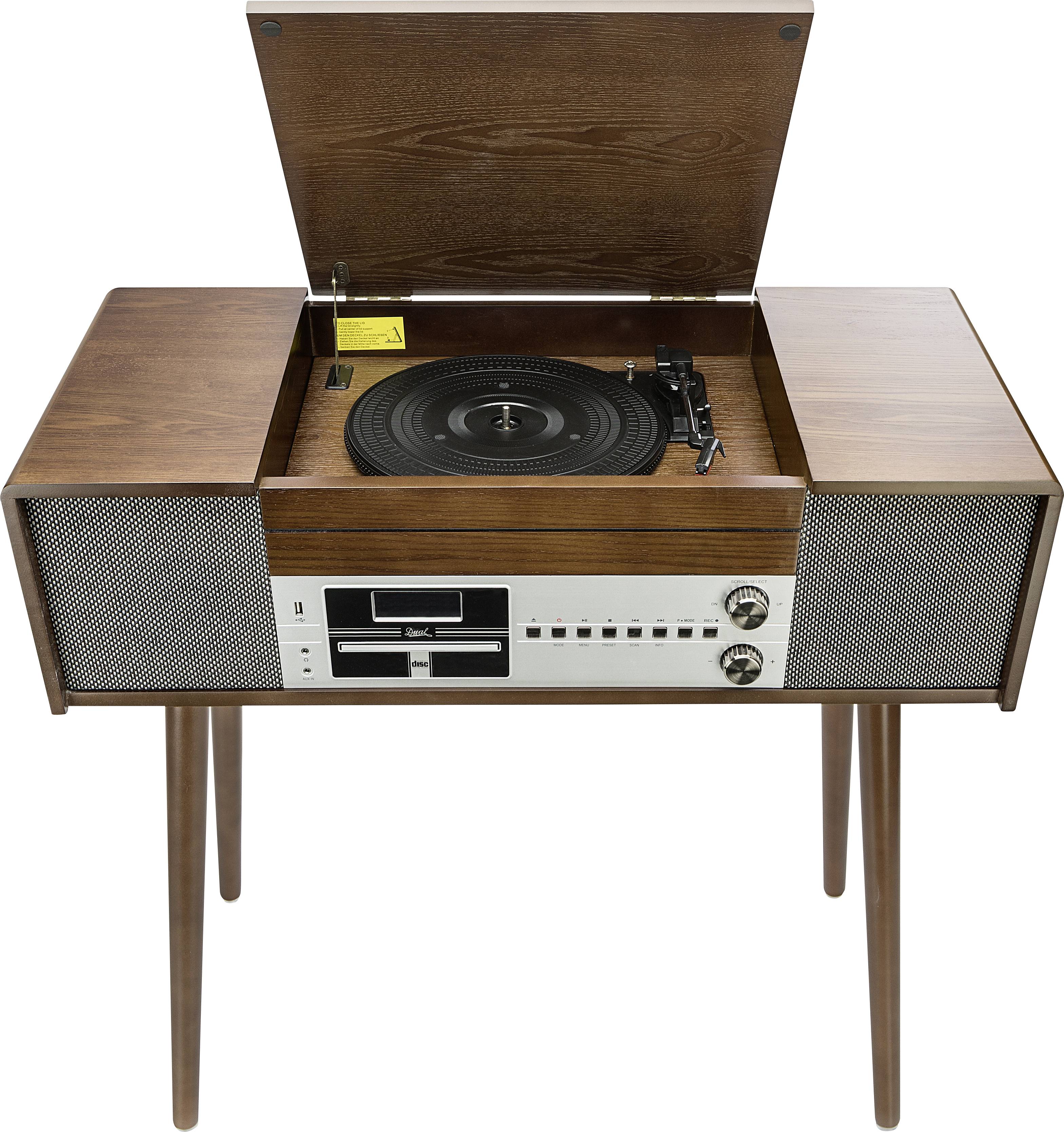 In diesem nostalgischen Musikcenter ist moderne Technik verbaut. Hinter der Stofffront befinden sich zwei klangvolle Lautsprecher um Stereosound genießen zu können. Auf der Gehäusevorderseite befindet sich der USB-Anschluss, der CD-Player (unterstützt MP3), das LCDisplay sowie die wesentlichen Bedienelemente. Dank der Direct-Encoding-Funktion können Sie mit diesem Musikcenter Ihre Medien von CD, Radio (DAB+), von Bluetooth, vom Plattenspieler und vom externen AUX-IN Anschluss auf USB digitalisieren. Darüber hinaus können Sie über das Dual NR 60 DAB Ihre Lieblingsmusik per Bluetooth wiedergeben lassen und verwandeln das Gerät somit in eine Multifunktionsanlage. Auch ein Kopfhöreranschluss (3,5mm Klinke) sowie ein AUX-In-Eingang sind vorhanden. Die mitgelieferte Fernbedienung ermöglicht komfortable Bedienung von der Couch aus. Über die Bedienknöpfe können Sie bequem zwischen den einzelnen Funktionen wechseln ohne lange nach der richtigen Taste suchen zu müssen. Auf der Gehäuseoberseite ist der Schallplattenspieler integriert um alt entbehrte Schätze wieder genießen zu können.