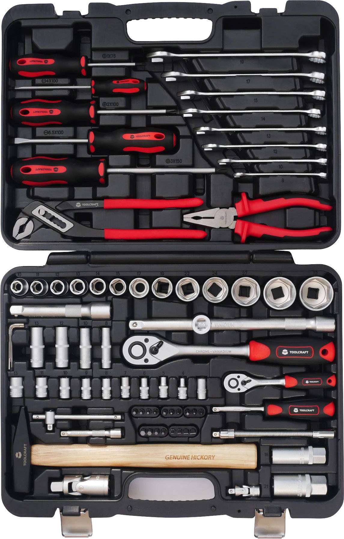 Buchsen, 1/2 Zoll10, 11, 12, 13, 14, 15, 17, 19, 22, 24, 27, 30, 32 mm + Buchsen, 1/4 Zoll4, 5, 6, 7, 8, 9, 10, 11, 13 mmTiefe + Buchsen, 1/4 Zoll8, 10, 12, 13 mm + Zündkerzen-Steckschlüssel16 und 21 mm + 1/2-Zoll-Schnellverschluss-Ratsche + 1/2-Zoll-T-Gleitgriff1/4-Zoll-Schnellverschluss-Buchsenratsche + 1/4-Zoll-T-Gleitgriff + 1/4-Zoll-Drehgriff + 1/2-Zoll-Verlängerungen – 125 und 250 mm + 1/4-Zoll-Bedienelement – 75 mm + Flexible 1/4-Zoll-Verlängerung + 1/2-Zoll-Kreuzgelenk + 1/4-Zoll-Kreuzgelenk + 1/4-Zoll-Kupplung + 180-mm-Kombizange Wasserpumpenzange, 250mm + 18-teiliger Satz mit Sechskantbits + Sechskantbits: 3, 4, 5, 6 mm; + 1/4 Zoll Schlitzbits: 3, 4, 5, 6 mm; + PHILLIPS®-Bits: PH1, PH2, PH3; 1/4 Zoll + POZIDRIV®-Bits: PZ1, PZ2, PZ3; 1/4 Zoll + TORX®-Bits: T10, T15, T20, T25; 1/4 Zoll + Kombinationsschlüssel 8, 10, 12, 13, 14, 15, 17, 19 mm + Schlitzschraubendreher6 x 100, 4 x 100 mm + PHILLIPS®-SchraubendreherPH1 x 75, PH2 x 100, PH3 x 150 mm + Innensechskantschl