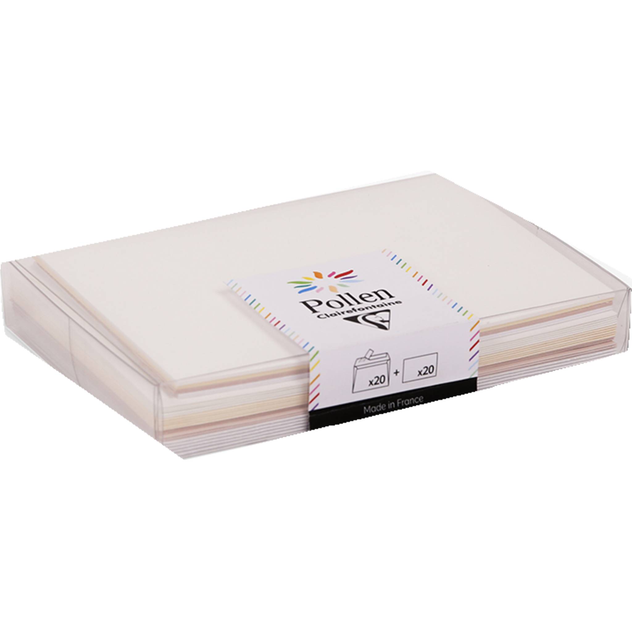 Pollen, Set mit 20 Umschlägen C6 (114x162mm) + 20 Karten 110x155mm, Hochzeit Mit diesem Set haben Sie immer eine Auswahl an Karten und Umschlägen zur Hand, um Grüße zu versenden, eine Nachricht zu hinterlassen oder eine Einladung zu verschicken. Dieses Set beinhaltet 20 selbstklebende Umschläge 120g im Format C6 (11 ,4x16,2cm) mit einer Auswahl an 4 themtischen Farben (Perlmuttweiß, Opalin, Elfenbein, Naturweiß) und 20 einfache Karten 210g im Format 11x15,5cm. Das Papier ist säurefrei, beschreibbar und für den Laser- oder Tintenstrahldruck geeignet. Es kann auch geprägt, perforiert, gestemp elt, kalligrafiert und geschnitten werden, um allen kreativen Bedürfnissen und Wünschen gerecht zu werden. Die Umschläge und Karten werden in unseren Werkstätten in Etival-Clairefontaine in den Vogesen mit einem seit 1880 unübertroffenen Know-how hergestellt. Die FSC-Zertifizierung des Papiers garantiert die Verwendung kontrollierter und verantwortungsvoll entnommener Ressourcen für eine angepasste Waldbewirtschaftung.